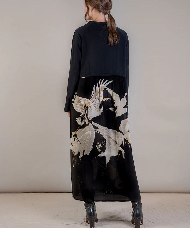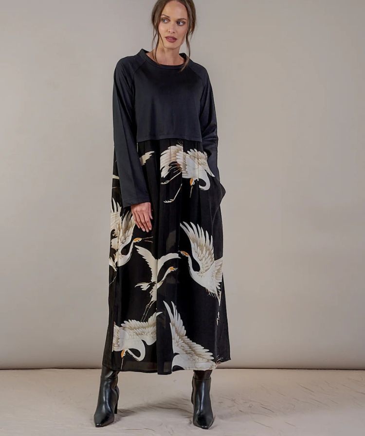 NEW Slouch Dress is a comfortable and easy-wear piece that features this season's prints with a coordinating block colour top. A flattering neckline and a high waistline skirt with deep pockets make this new style perfect for updating your winter wardrobe