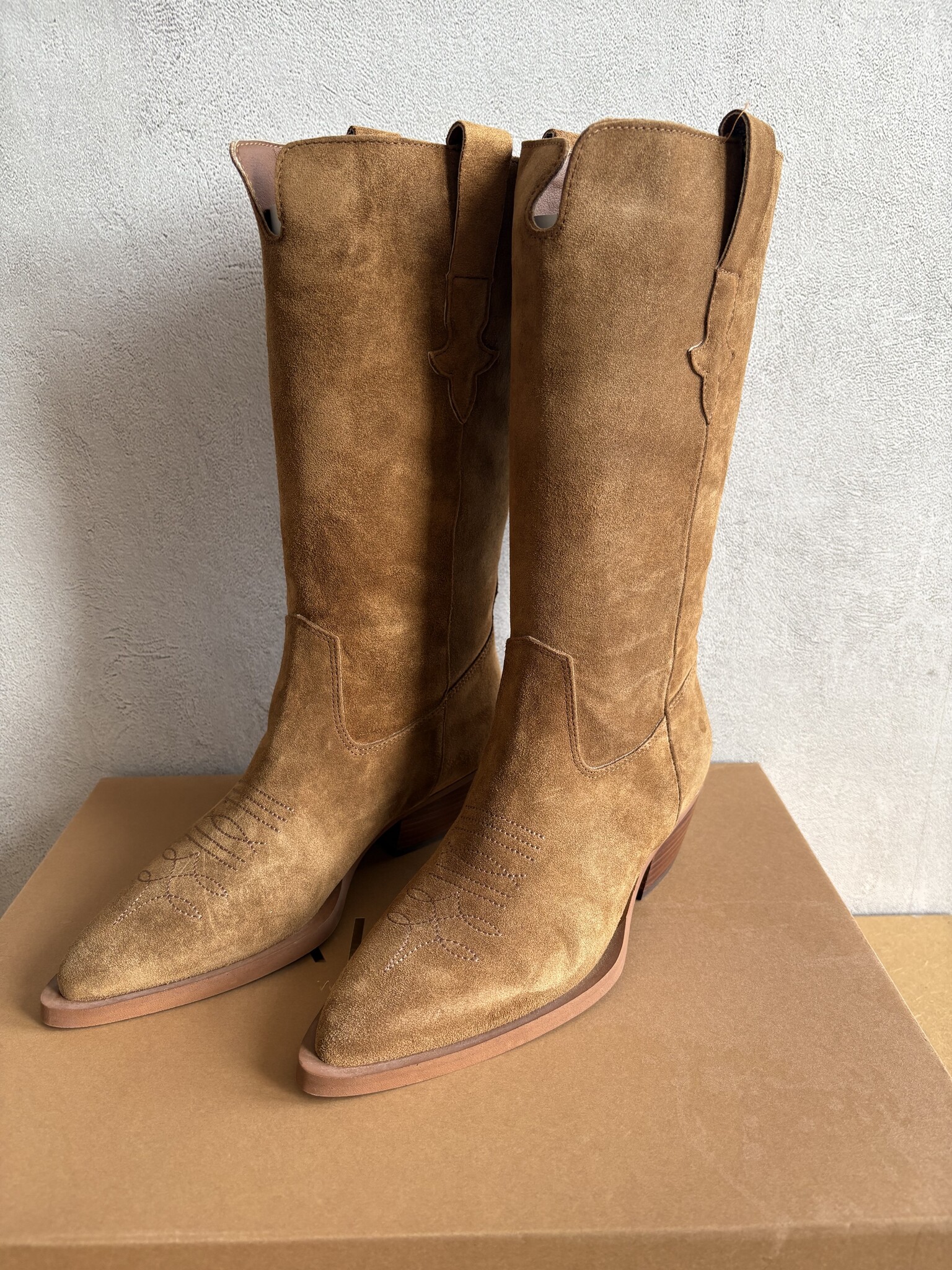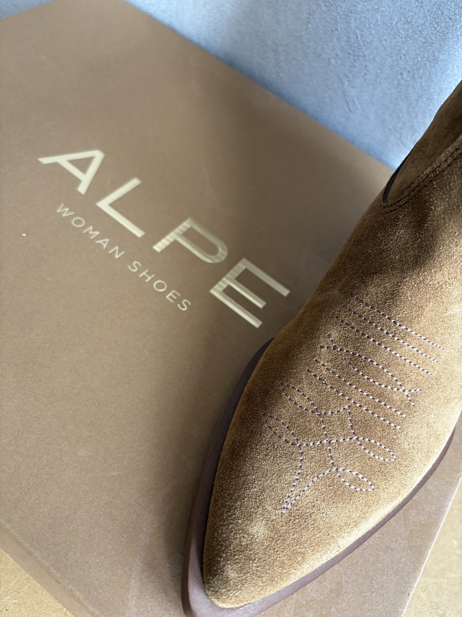 ALPE woman's cowboy boot in a suede leather with pull on tabs for easy wearing.
