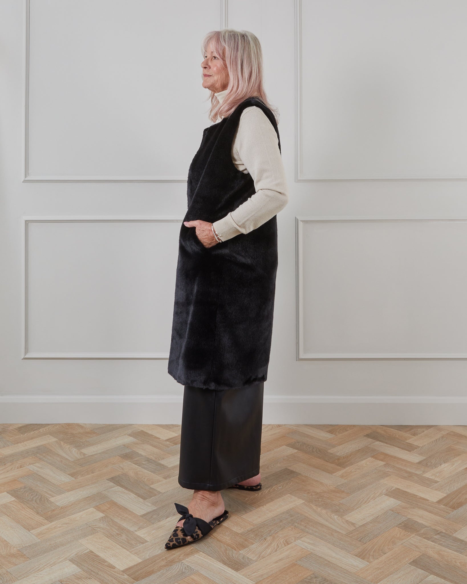 Expertly crafted from luxurious short flat fur - a timeless addition to any wardrobe. The longer gilet hits above the knee, making it easy to layer and adding warmth without bulk. Pair it with a skirt and leather pants for a chic and sophisticated look.