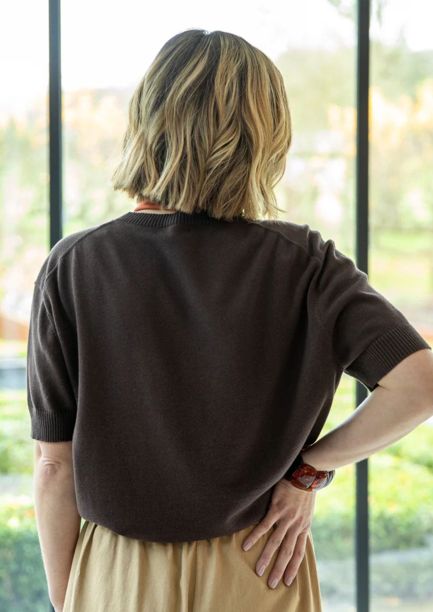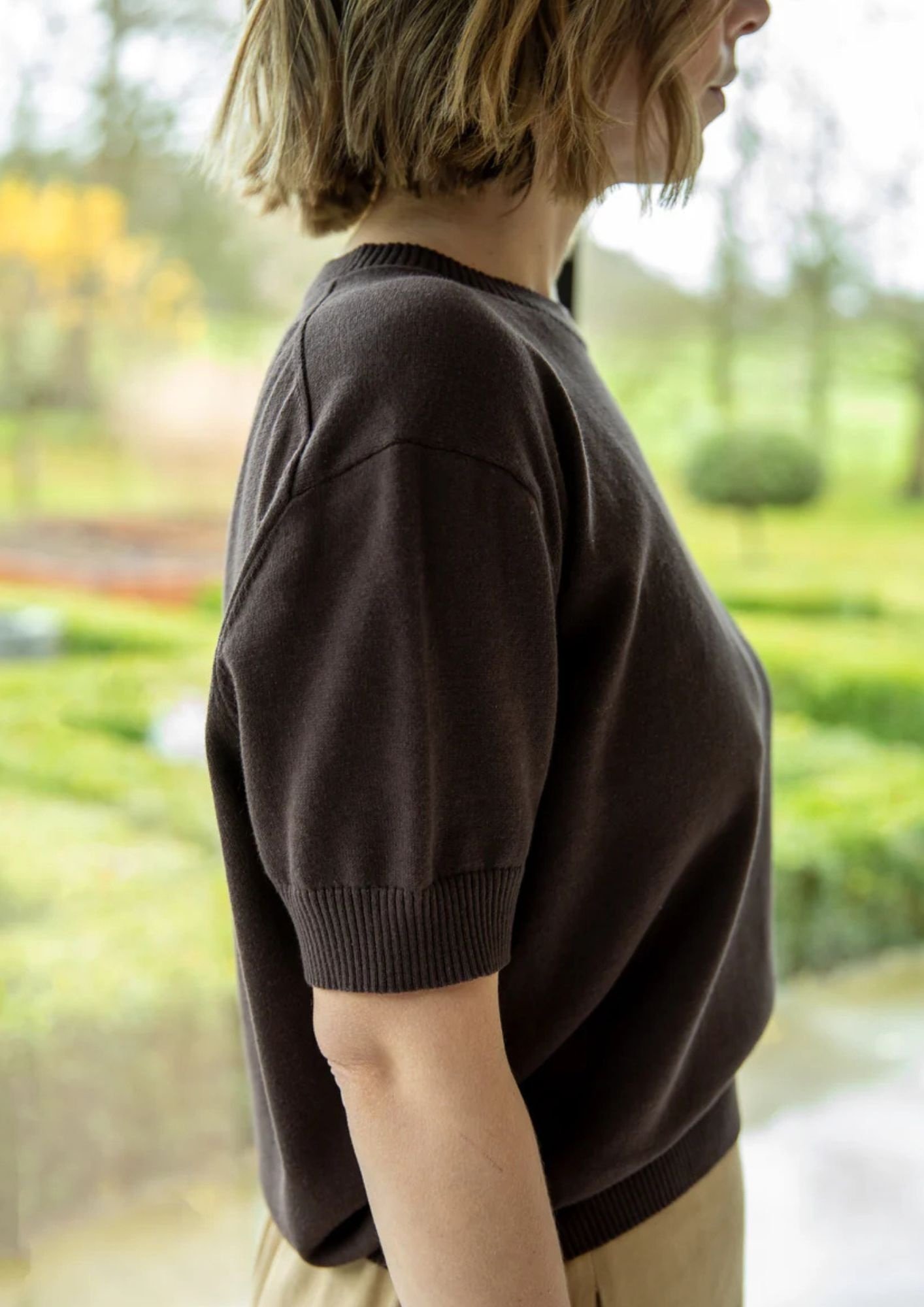 The Casey Top is a short drop sleeved knit, has a draped silhouette and cinched ribbed waistband which gives shape without being fitted. Casey has a classic round neck with a ribbed detailing.