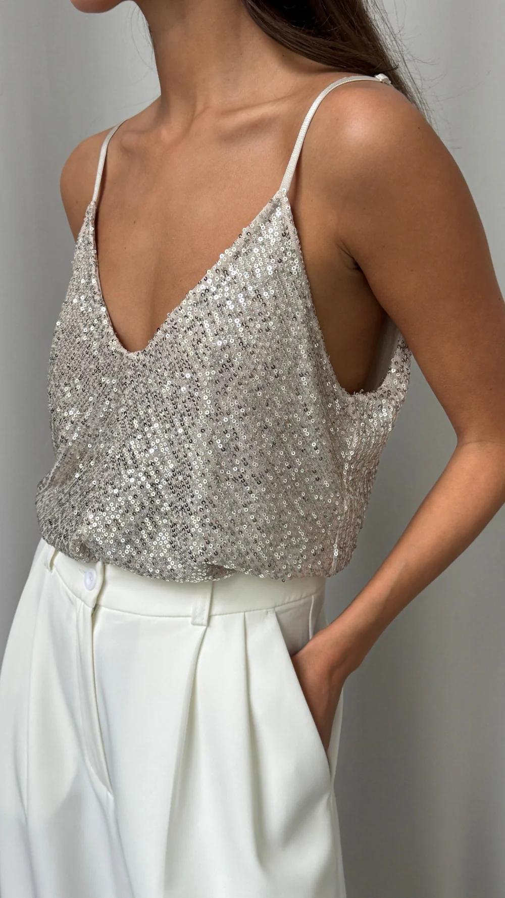 The perfect seasonal item. V-shaped neckline with matching back and adjusters to suit any shape. Lined with soft jersey fabric for comfort. Team with a jacket or any soft tailoring trouser for an effortlessly chic look . Sequins aren't just for Xmas.