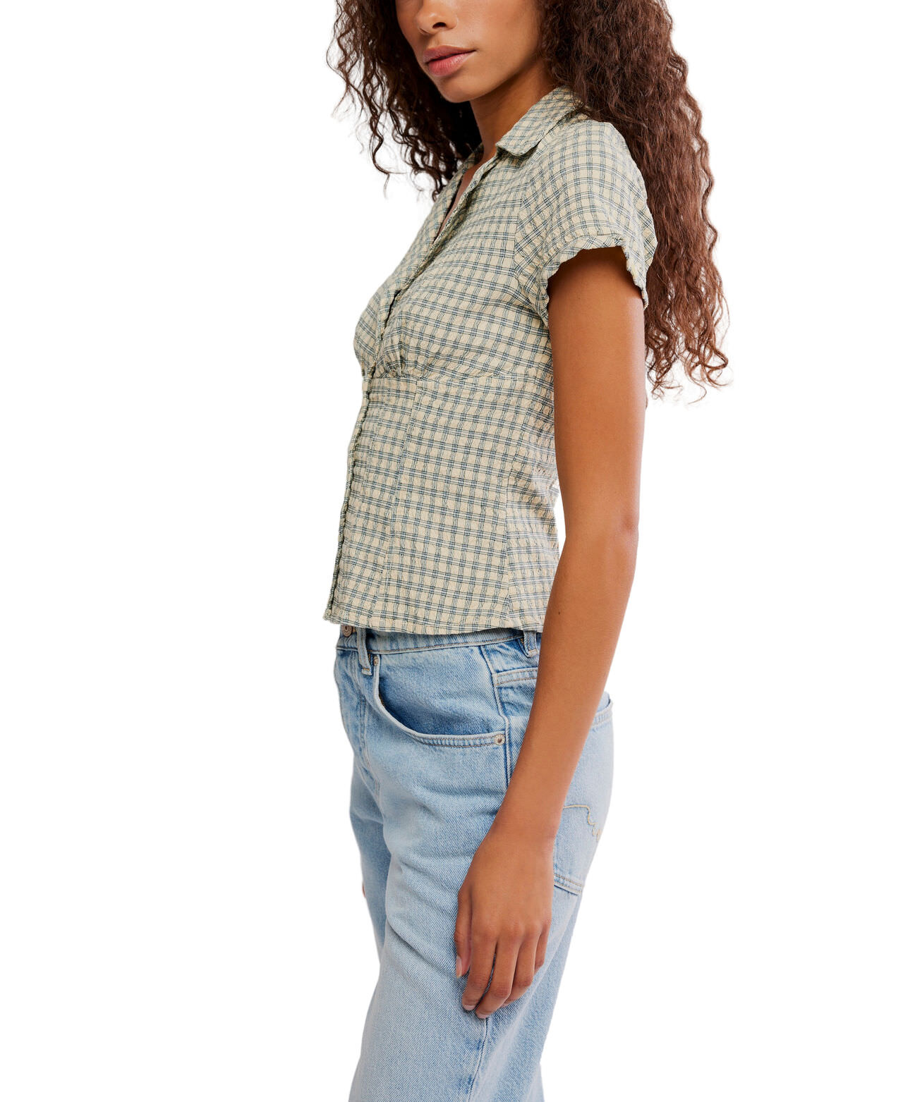 Add that vintage vibe to your look with this button-front top from We The Free, featuring a fitted bodice, ruched underbust, and collared V-neckline for an elevated finish.