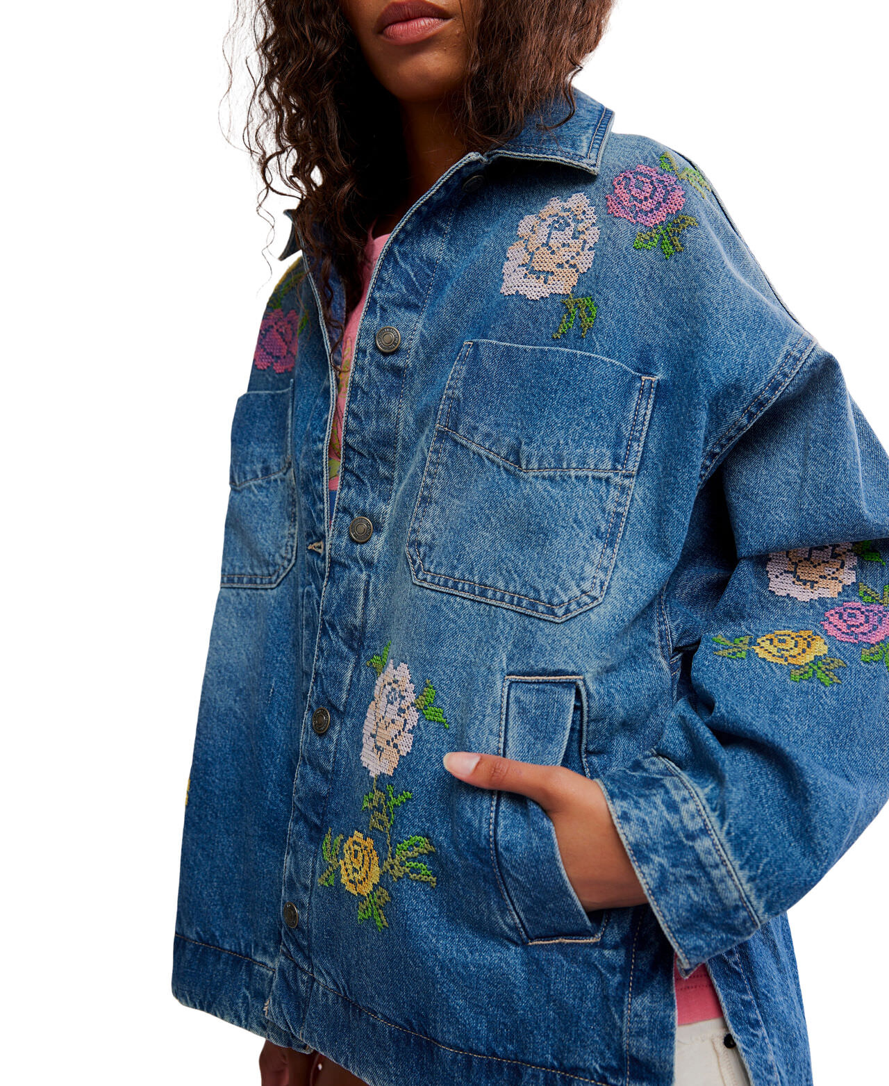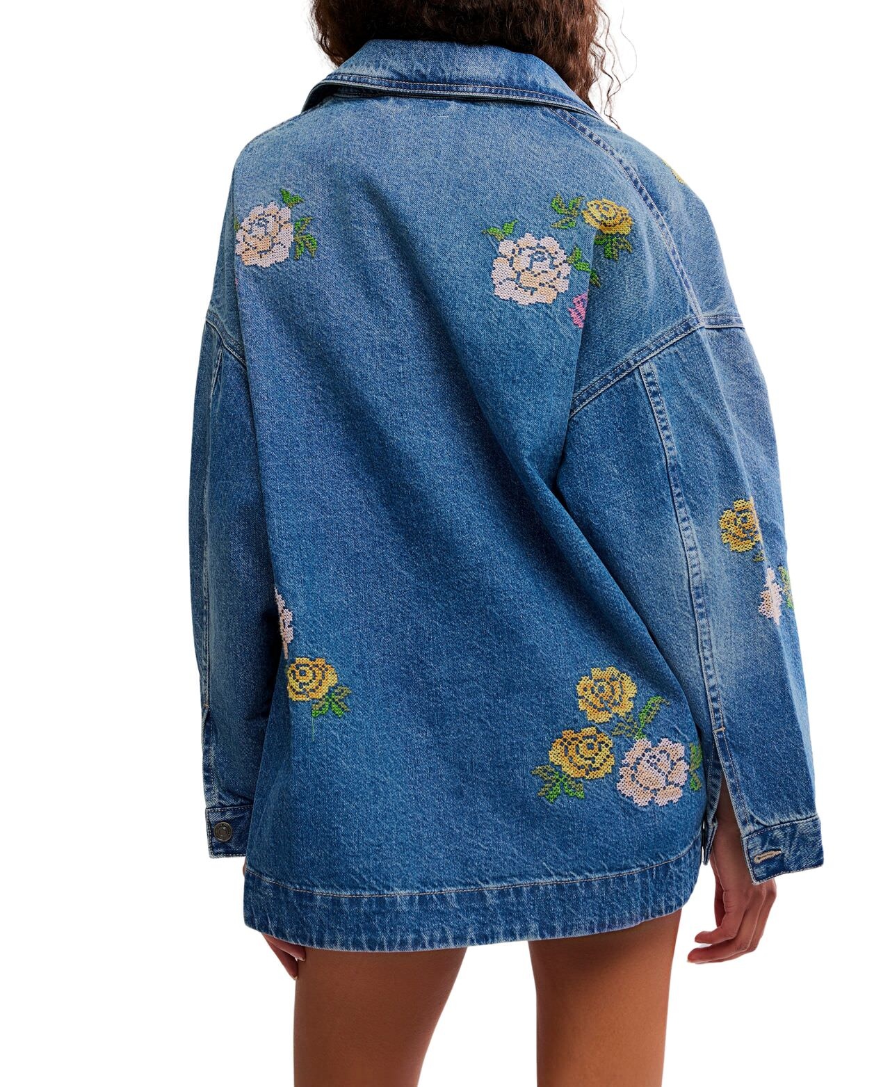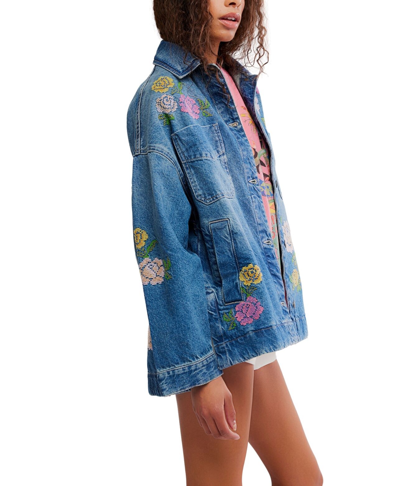 A We The Free fav, updated with celestial embroidery. Effortlessly cool in an oversized silhouette, this laidback jacket is featured in a button-down style with a collared neckline and pocket detail at the chest.