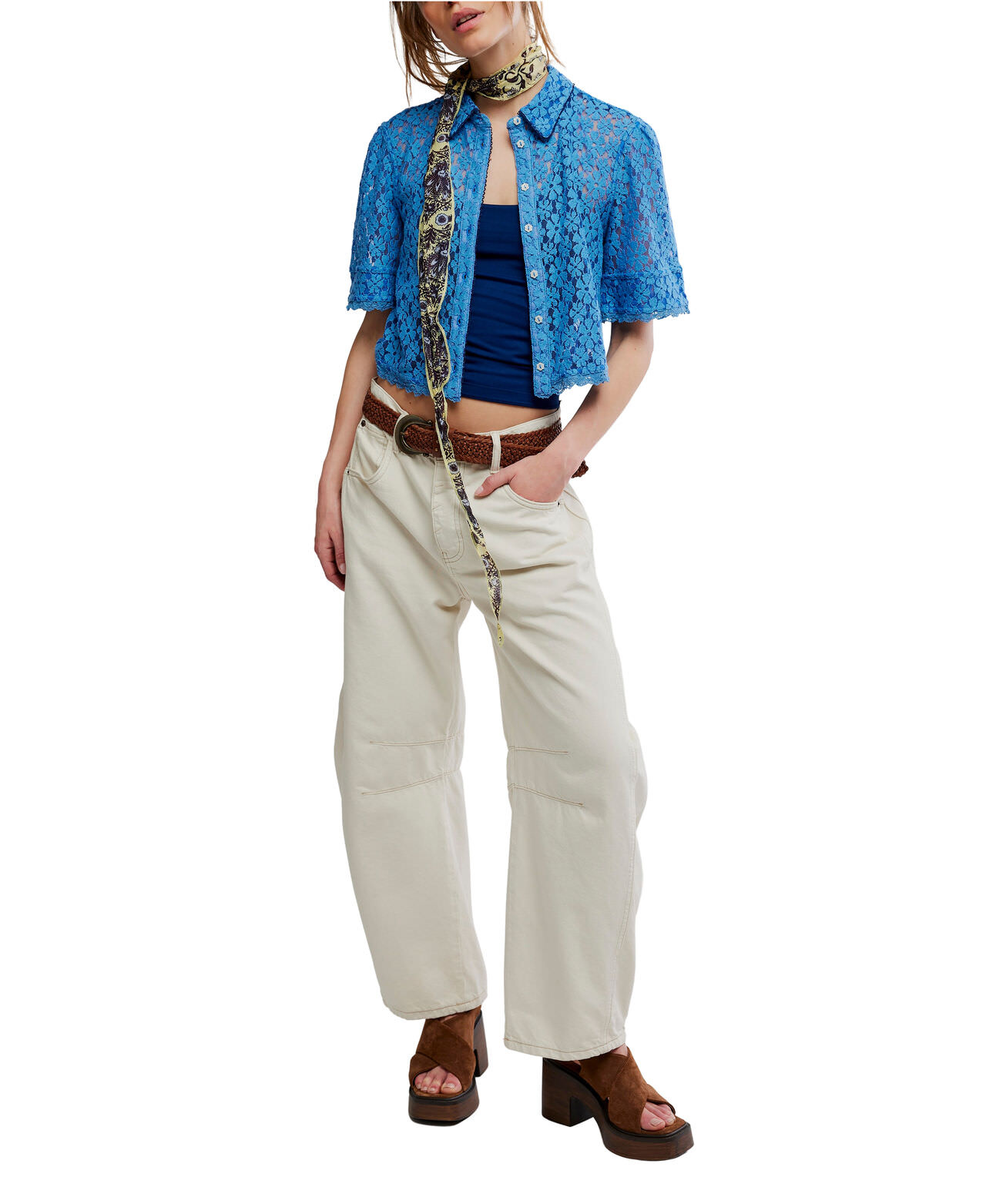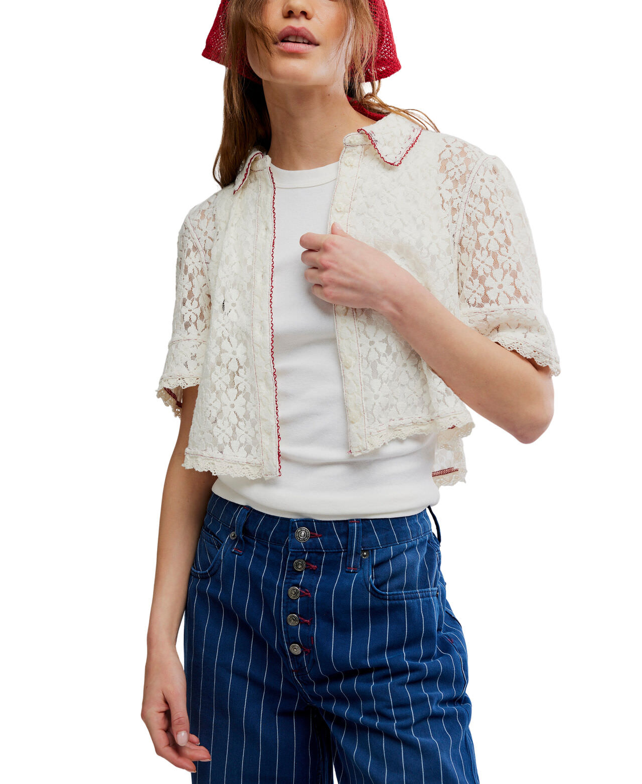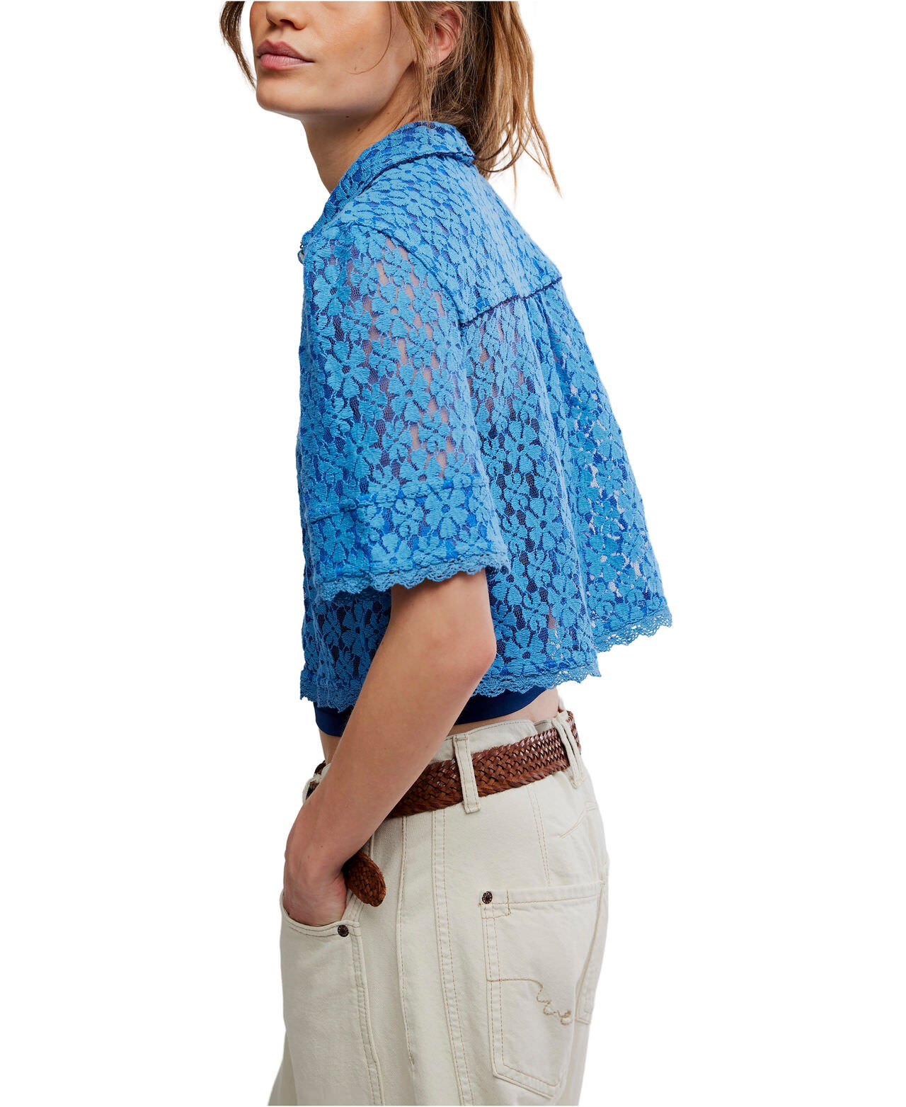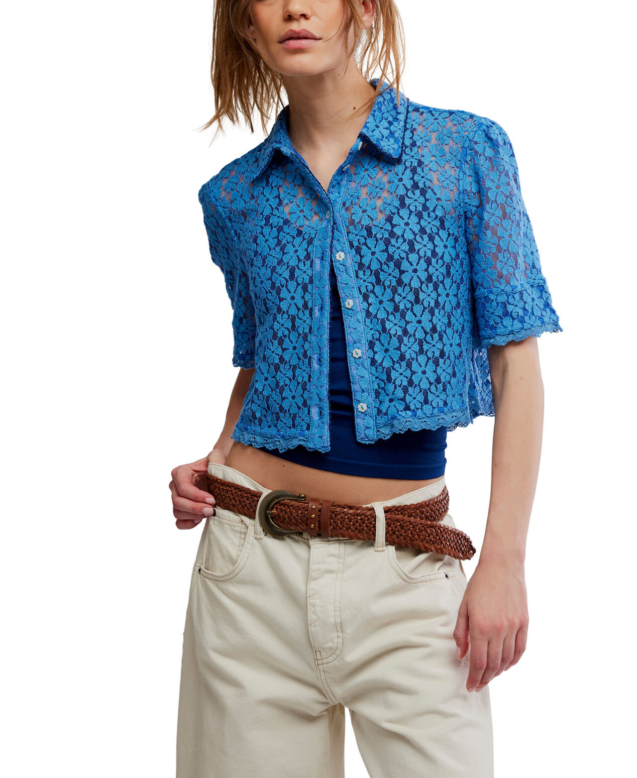So sweet and femme, this darling top features a semi-sheer lace fabrication, a cropped, boxy design, and a classic button-down silhouette that’s perfect for layering or styling solo.