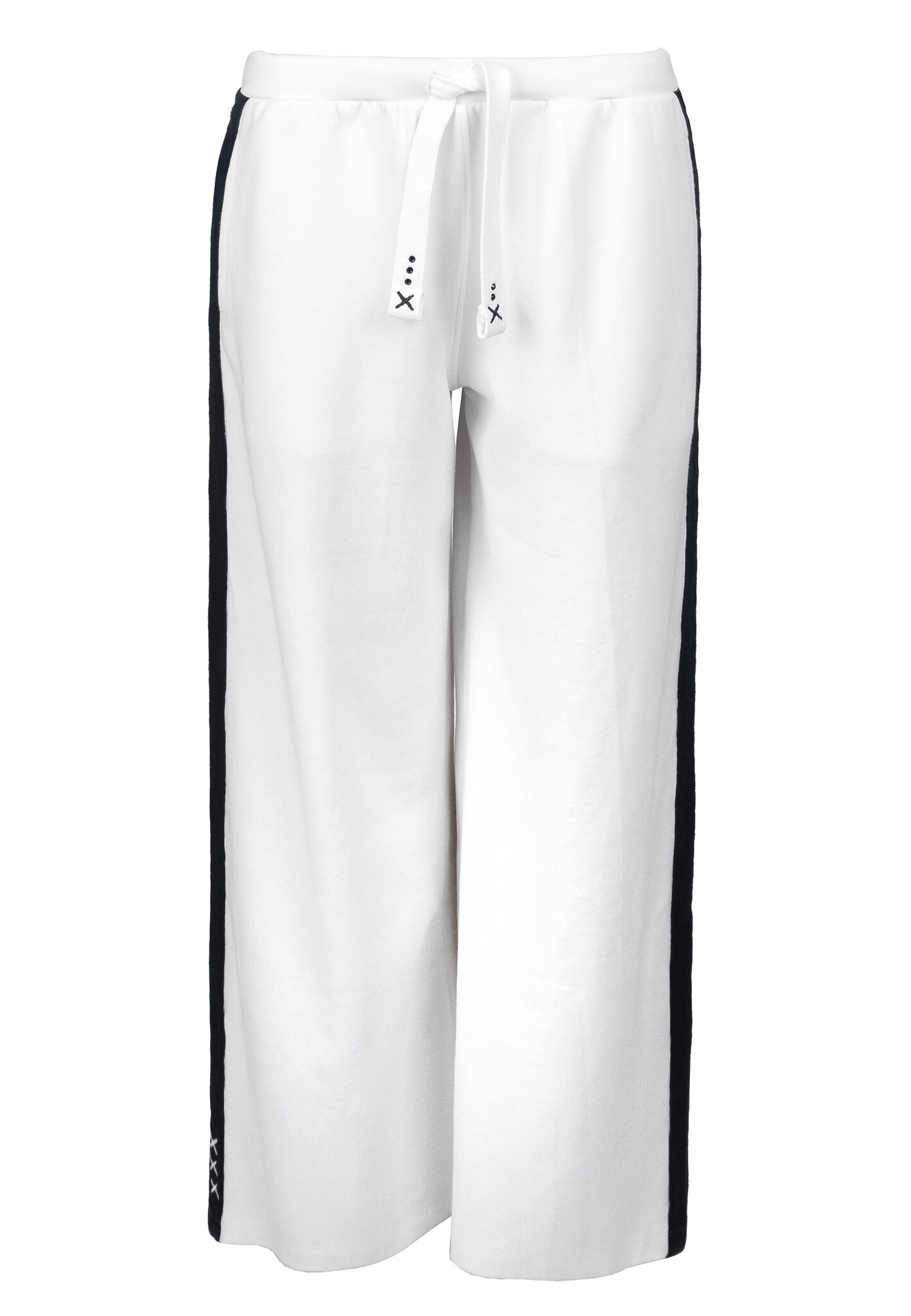 Wide leg white joggers with navy stripe for that sport look. Drawstring waistband.