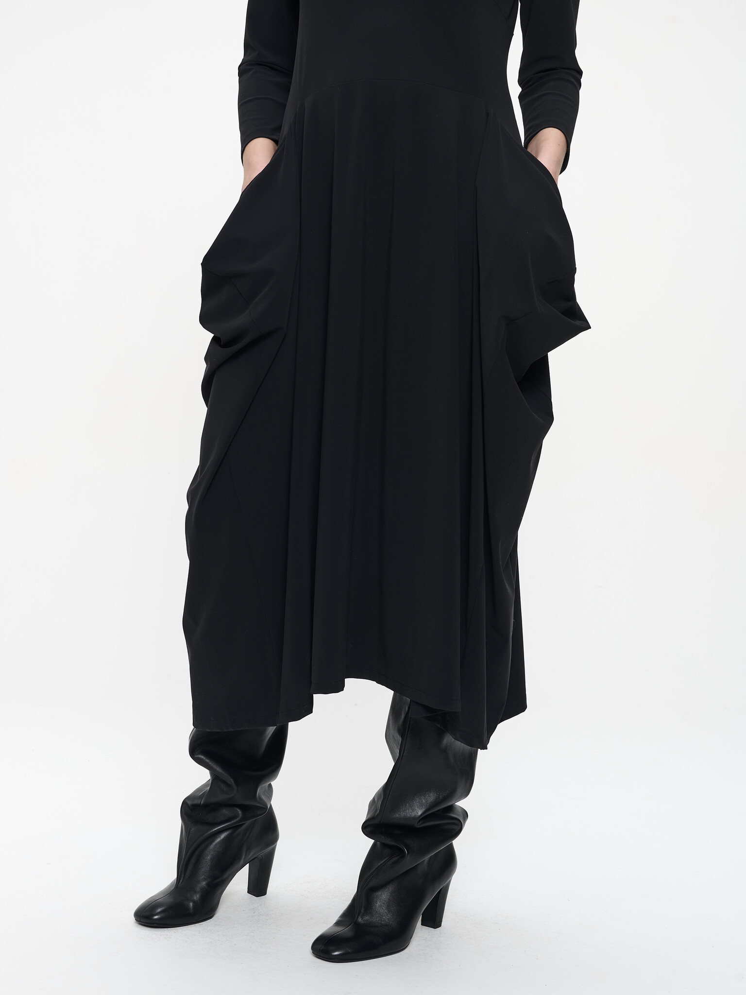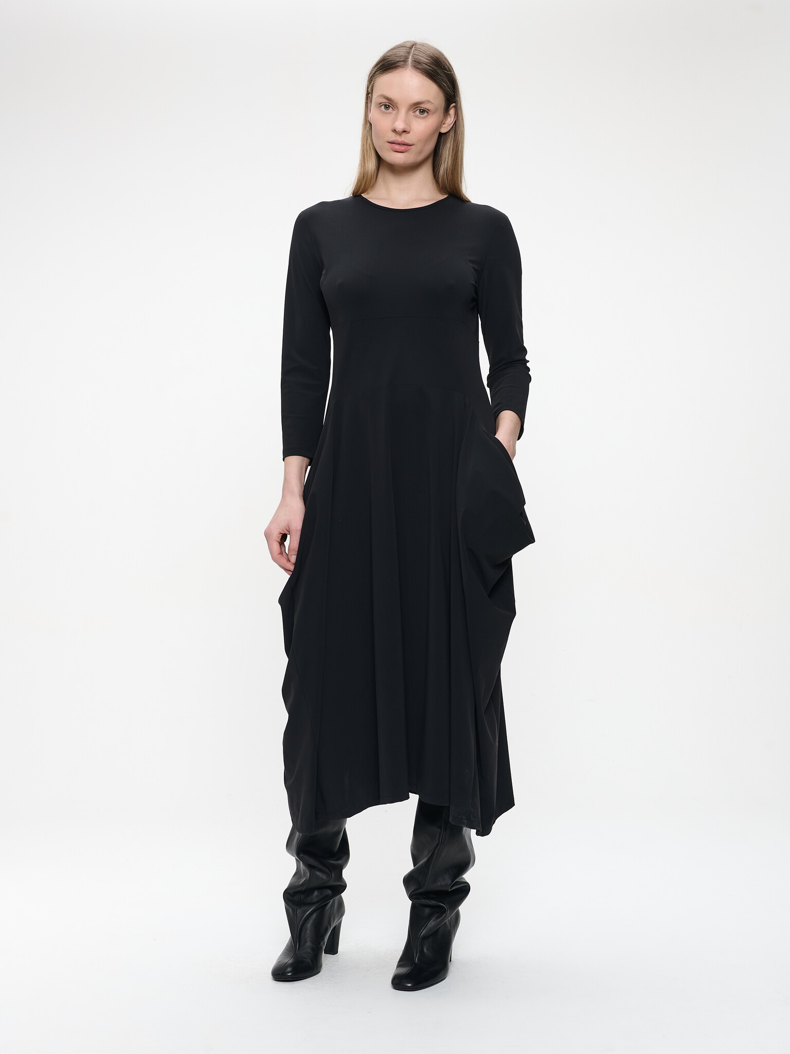 A standout piece with an artful edge, the Denise Dress features a fluid silhouette that drapes beautifully thanks to the technical jersey fabric. Its asymmetric hem and sculptural pocket detail add dimension and personality to the design.