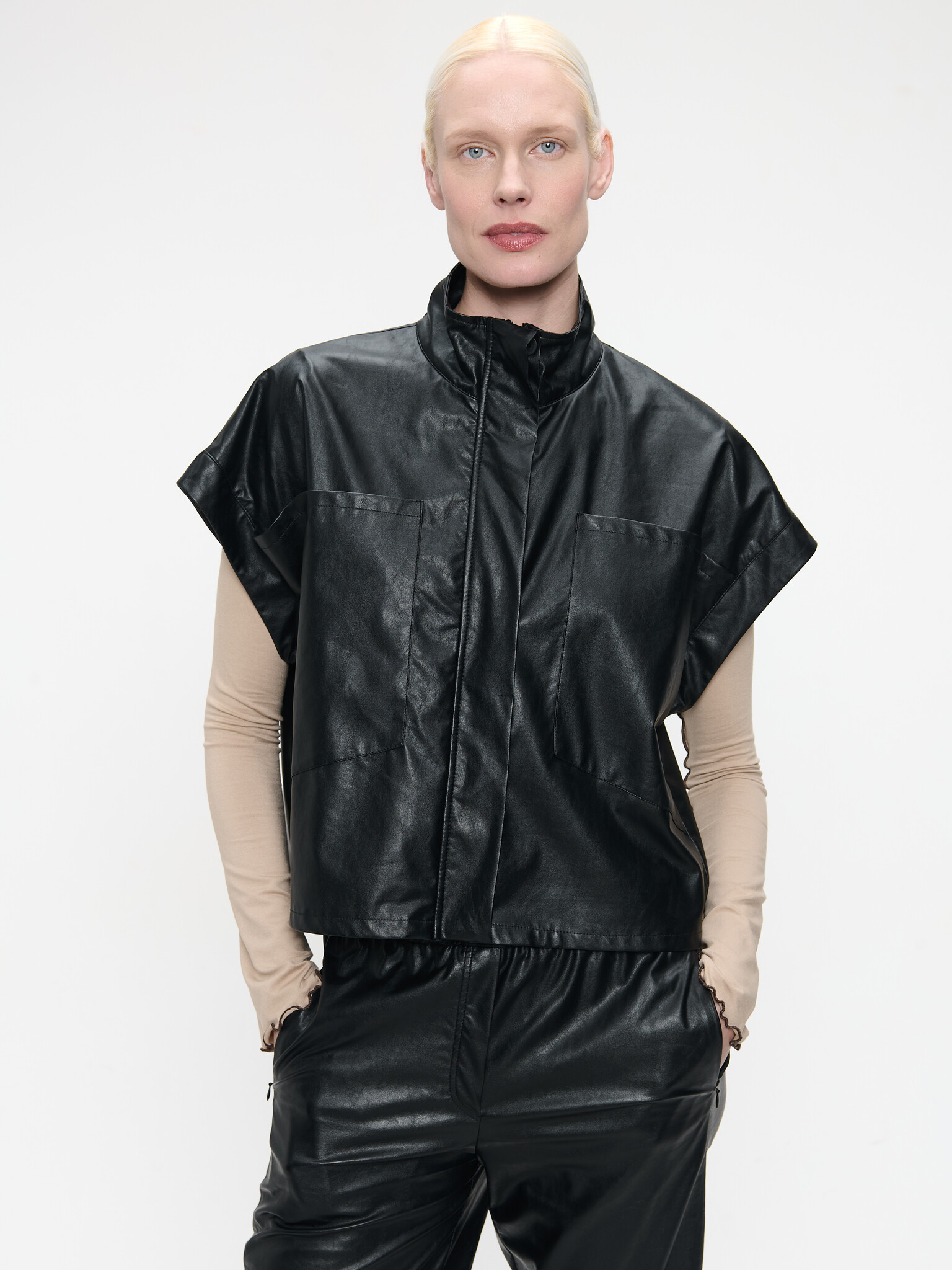 Add bold edge to your wardrobe with the Paola Eco Leather Blouse. This sleeveless design features a high stand collar, snap-button front, and a subtle boxy silhouette. Crafted from soft eco leather (100% viscose base), it delivers both structure and ease.
