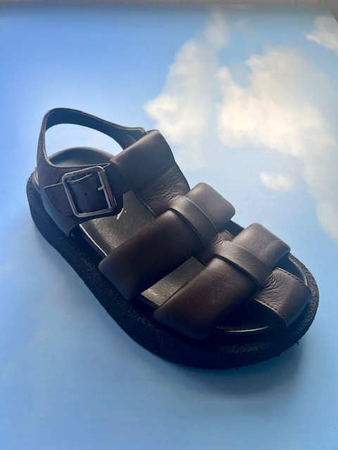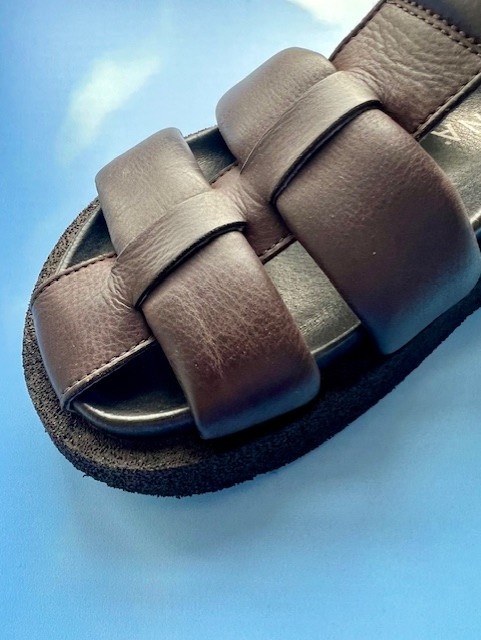Super smart dark brown leather sandal with three straps and a buckle closure. The sandal has a soft and comfortable footbed sole, which provides extra comfort. The model has a rounded sole, which is firm but at the same time surprisingly light.