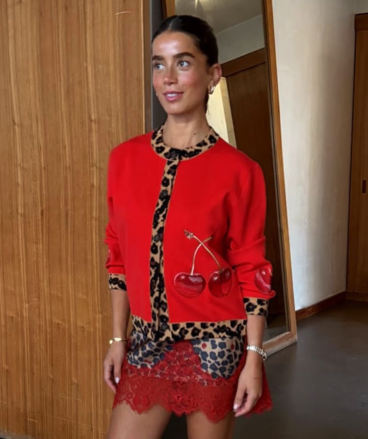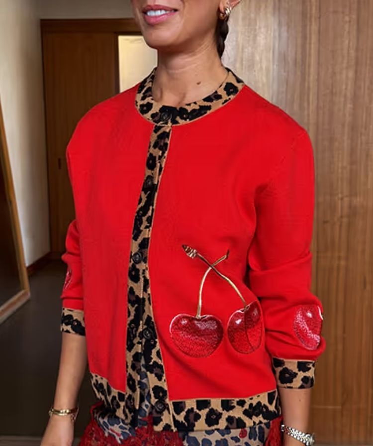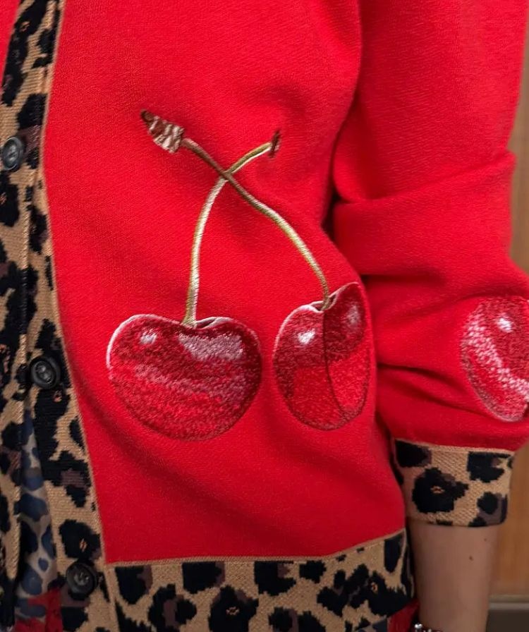 The weighty, soft touch knit fabric makes this cardigan feel so luxe and premium! A bright and bold red base embellished with the new cherry motifs.