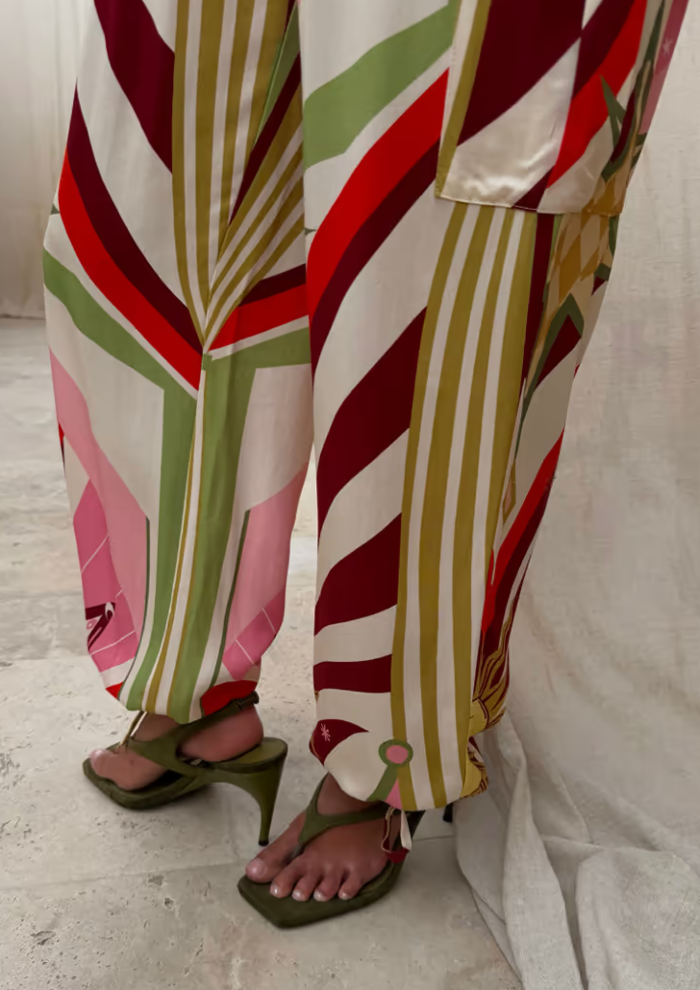 - A bright and bold abstract print. A chic balloon shape, adding a unique element of structure, an elasticated waistband for comfortability, side pockets and adjustable ties on the legs that allow you to style in a multitude of ways!