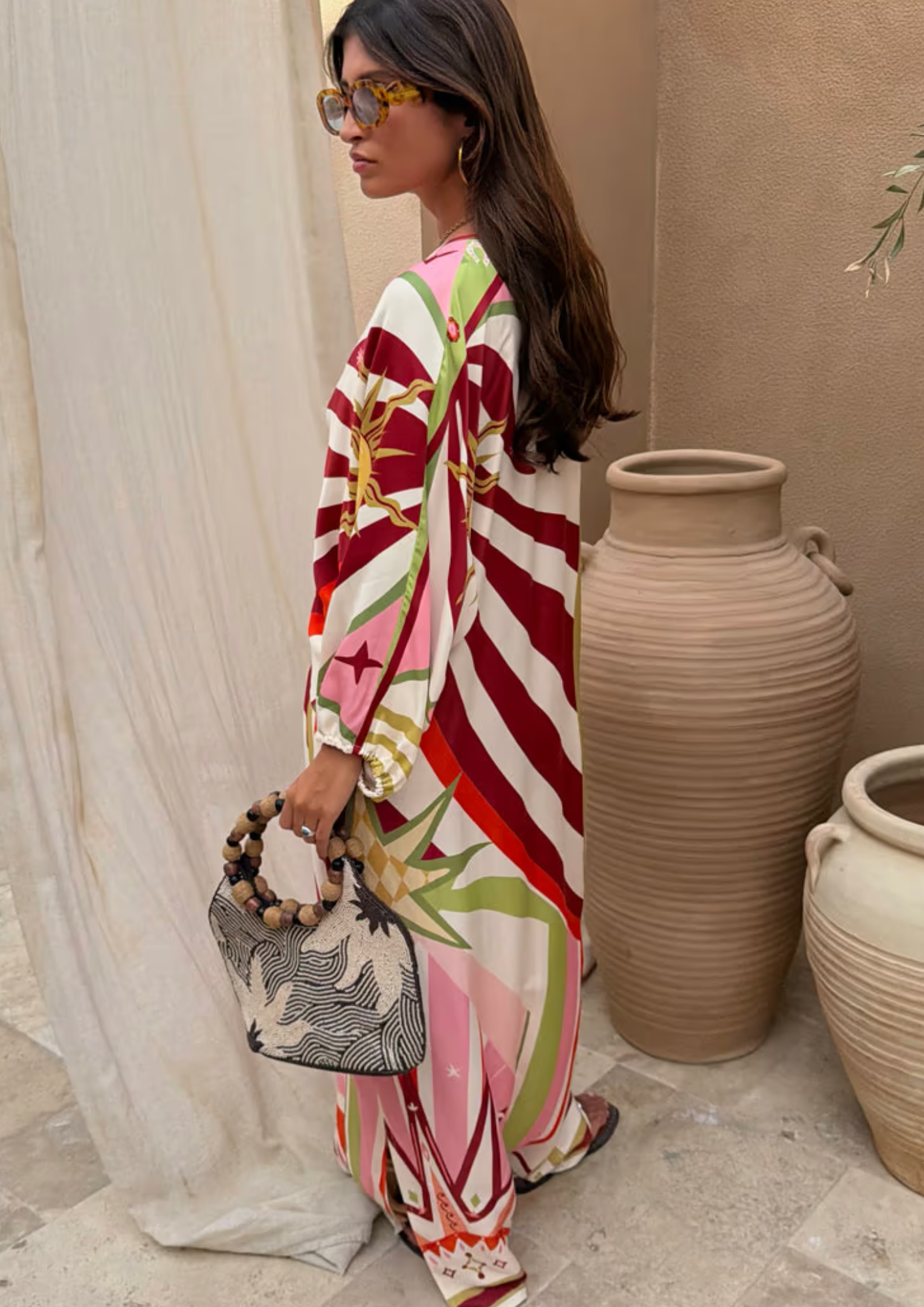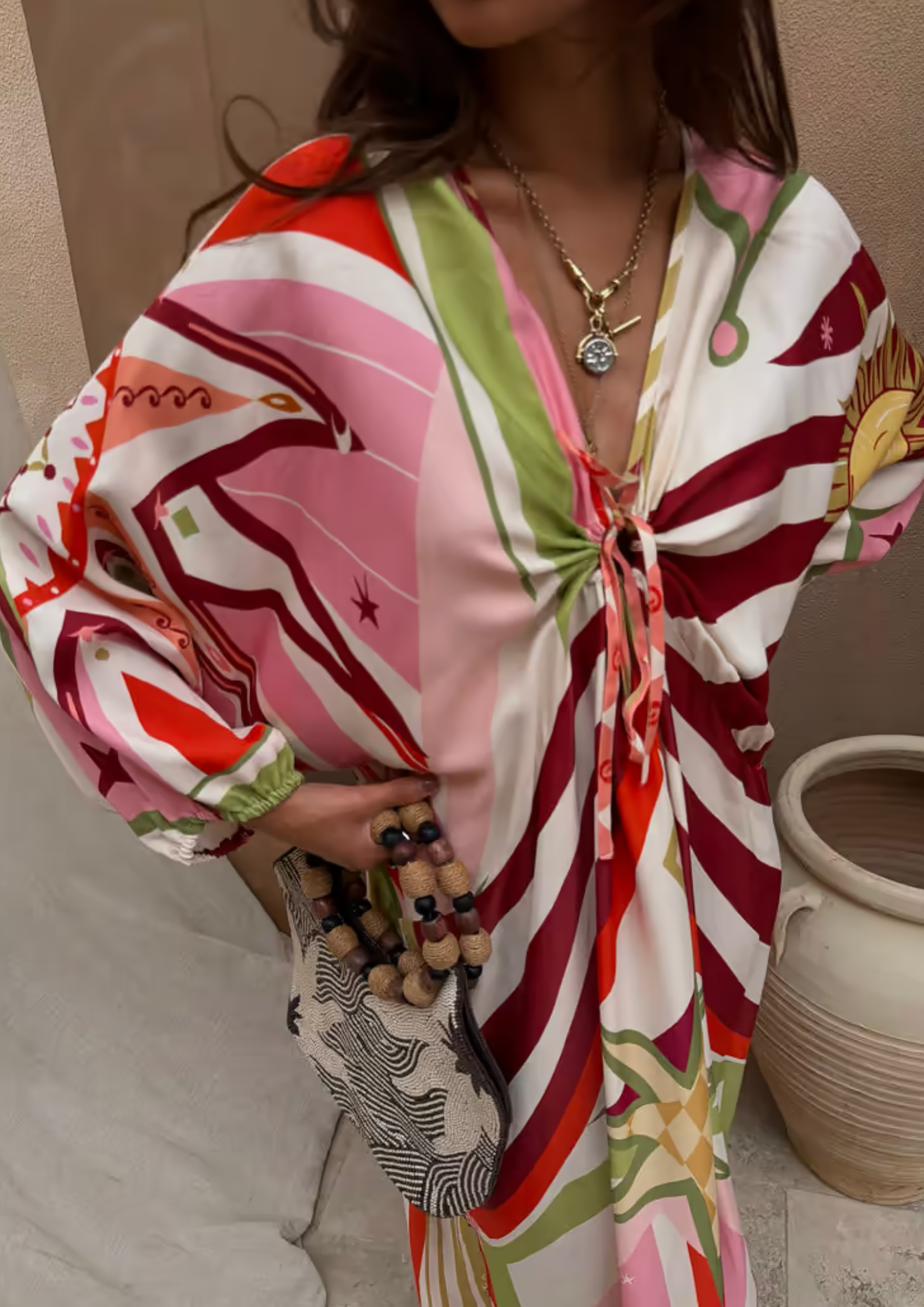 This dress is bringing all the feel good dressing vibes! The multicoloured design, featuring hand painted sun motif, paired with the relaxed silhouette makes this an essential holiday item! Team Sunday Best are in love with this shape.