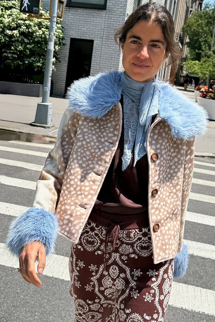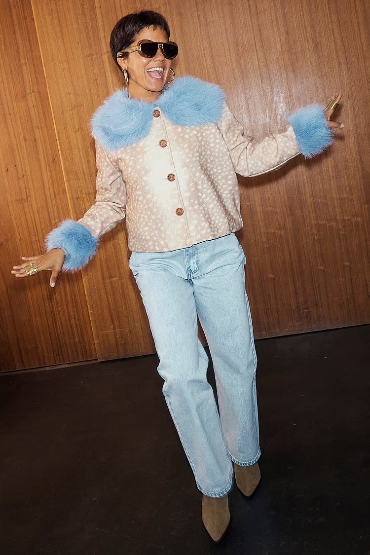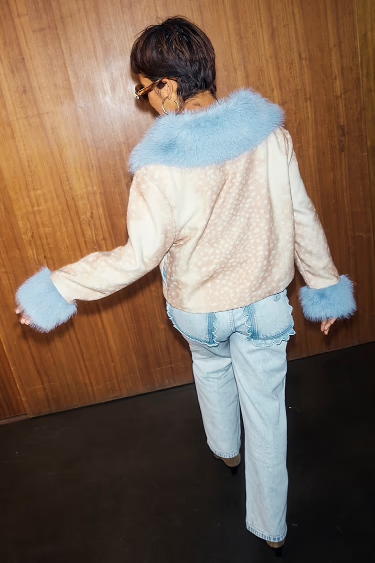 A soft touch fabric in blush and cream tones with a spotted deer print, trimmed with powder-blue faux fur on the collar and cuffs that add an extra element of texture. Endless styling opportunities!