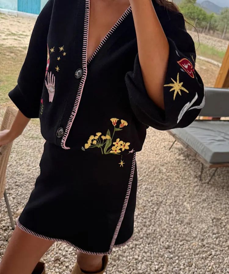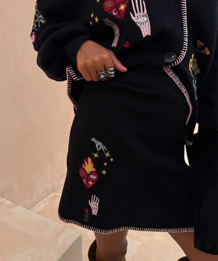 In a soft touch knit base that's lightweight, making it the perfect trans-seasonal piece. With blanket stitch detailing along the hem in a contrast pink and hand, star and heart motifs from the new night garden print.