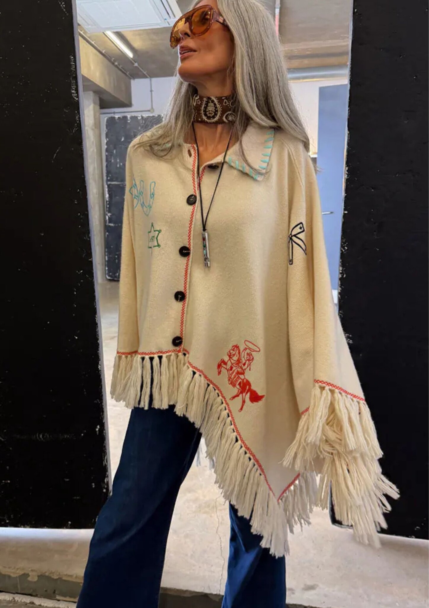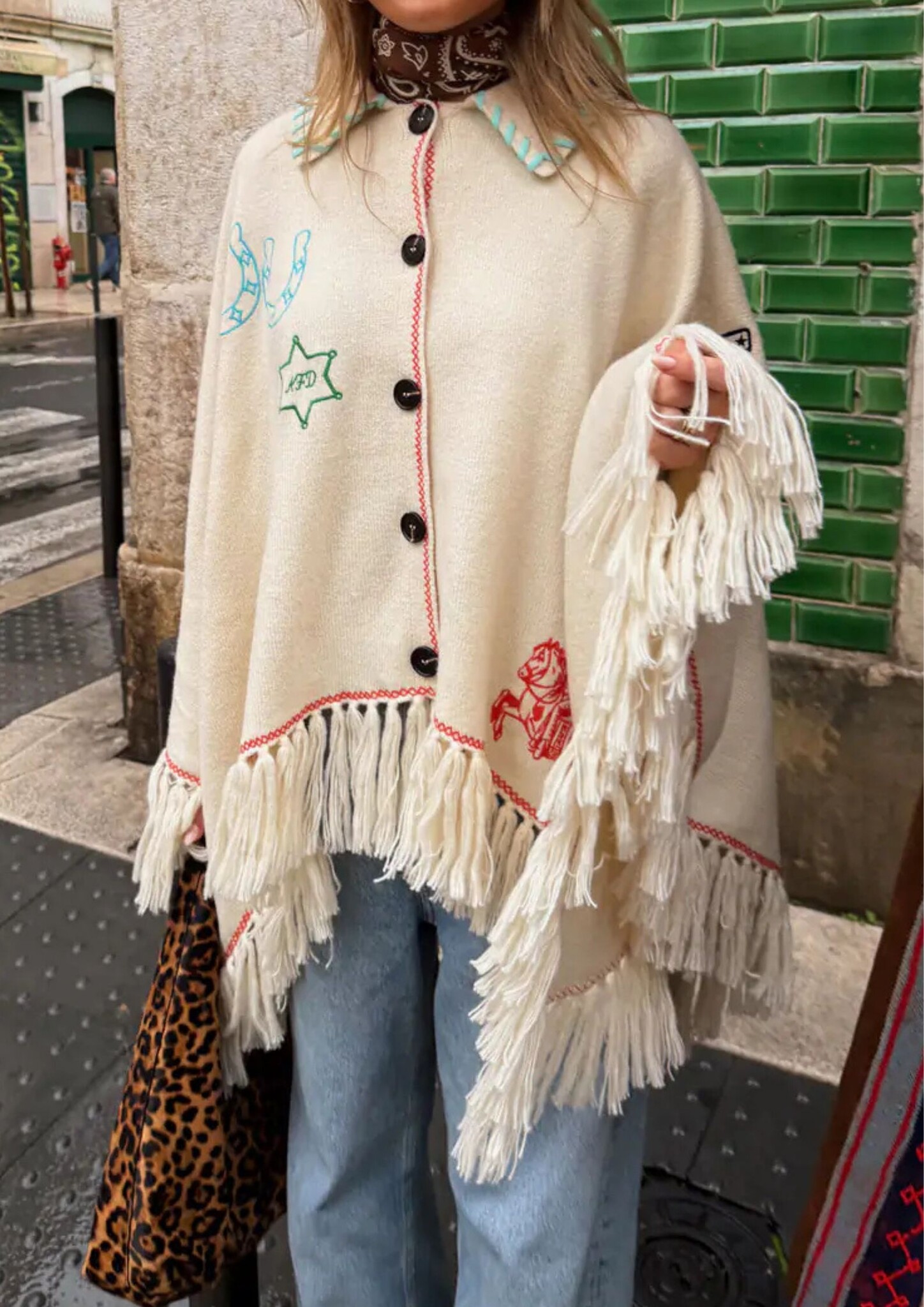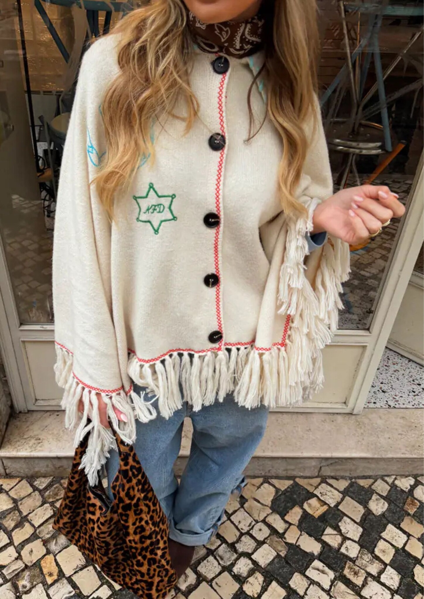 The thick, heavyweight knit base paired with the new western motifs and fringe detailing, make this a must have for your 2026 wardrobe. Never Fully Dressed have let the details do all the talking and kept it simple with jeans and a boot.