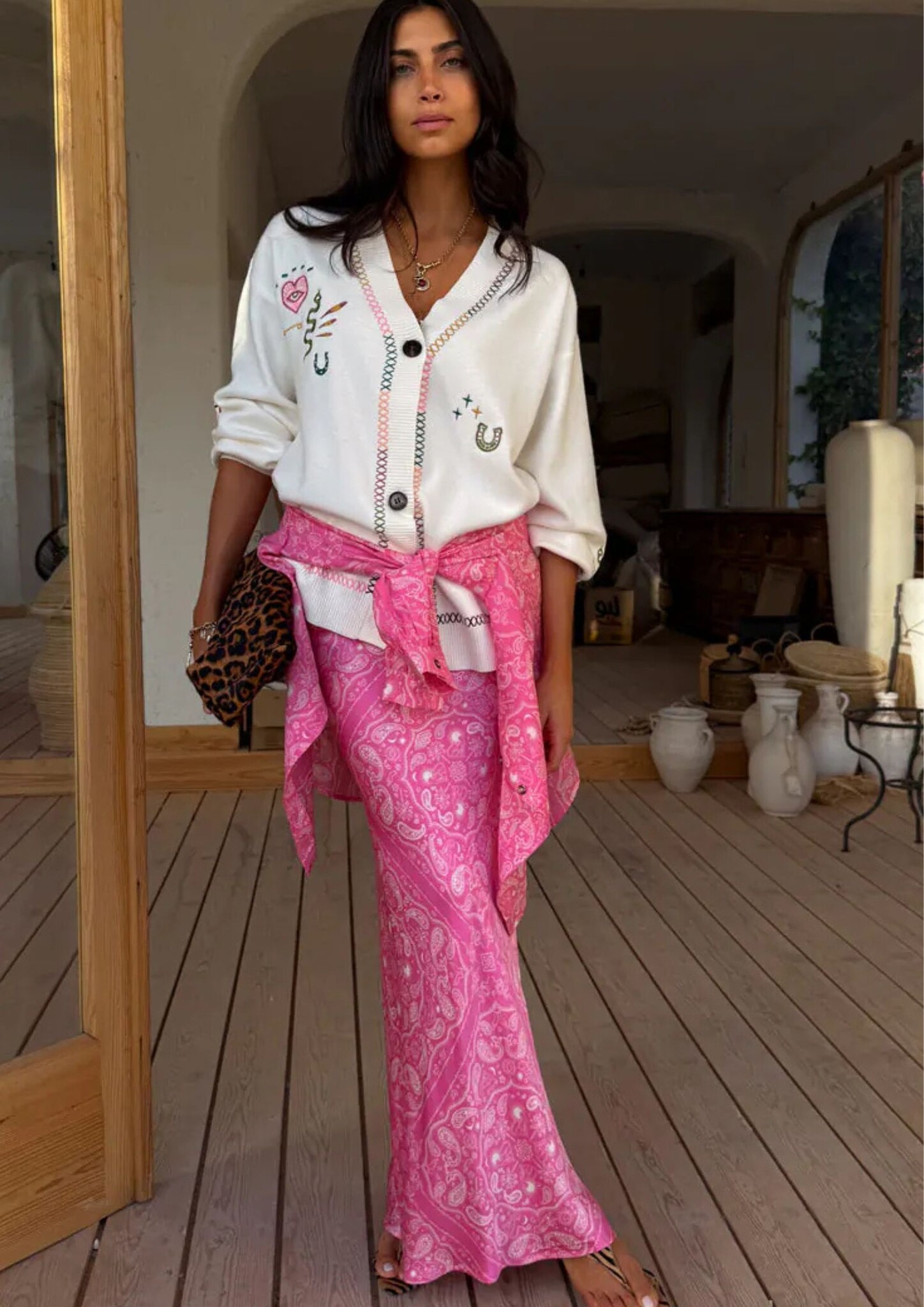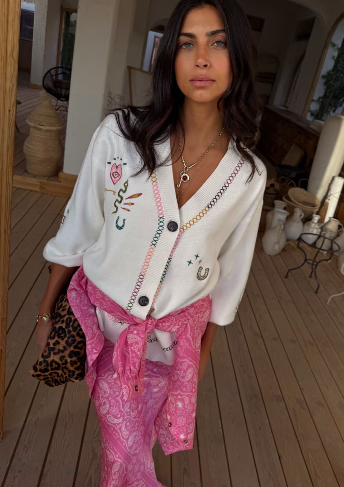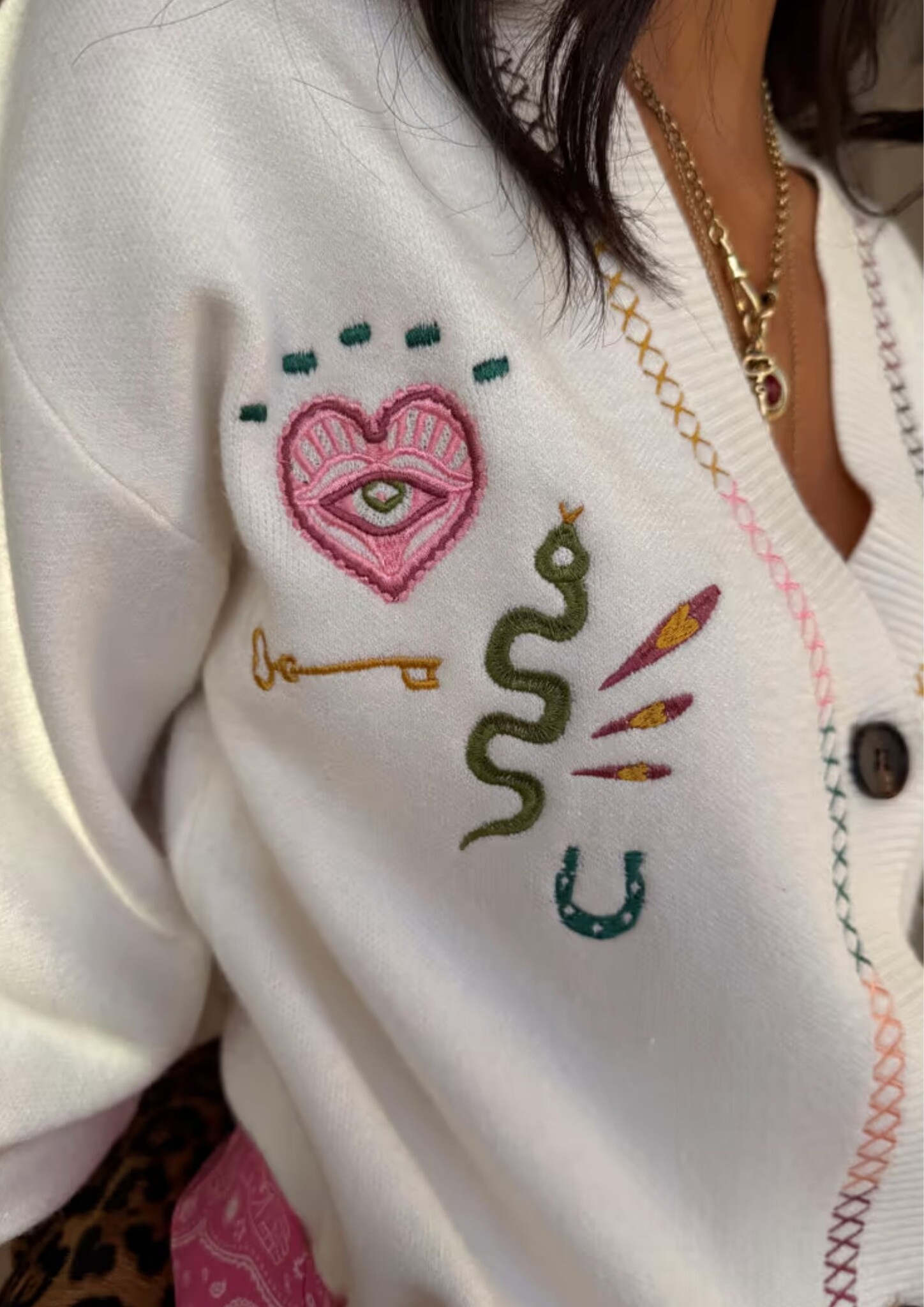 A soft touch knit base with criss cross stitch detailing along the the front hem and a mixture of classic and new western motifs in a range of deep tones. Designed to be styled in a multitude of ways, pair with a mesh dress or simply with your jeans.