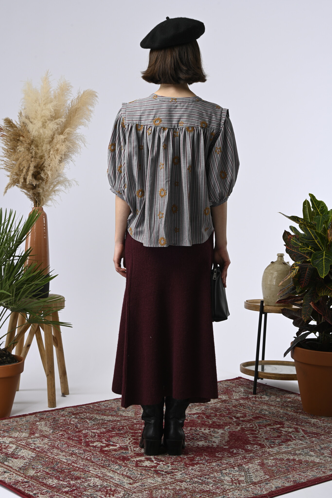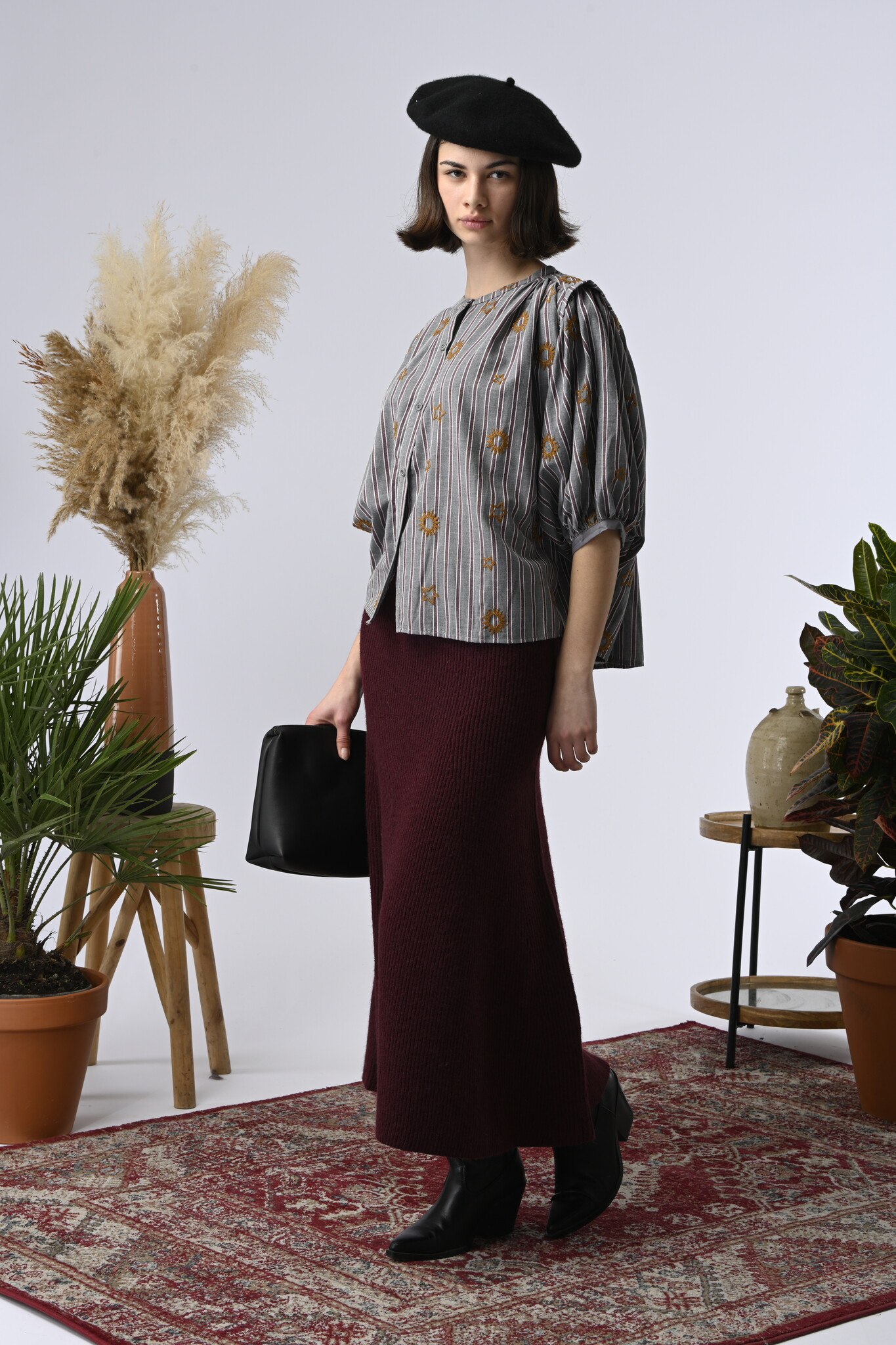 Loose blouse with balloon sleeves, embellished with contrasting embroidery. It brings a bohemian and poetic touch to your everyday outfits.