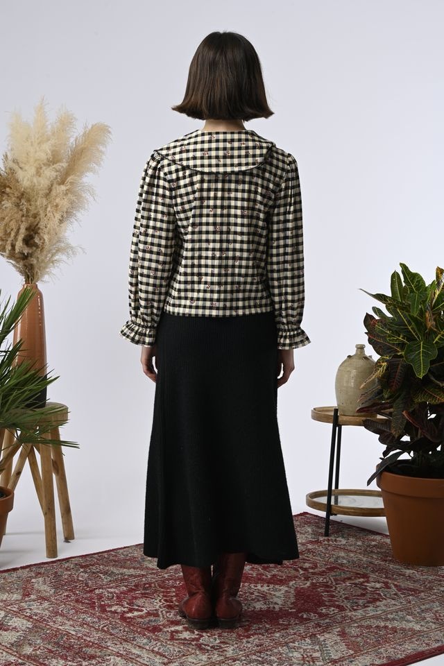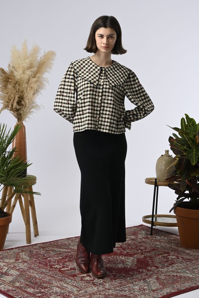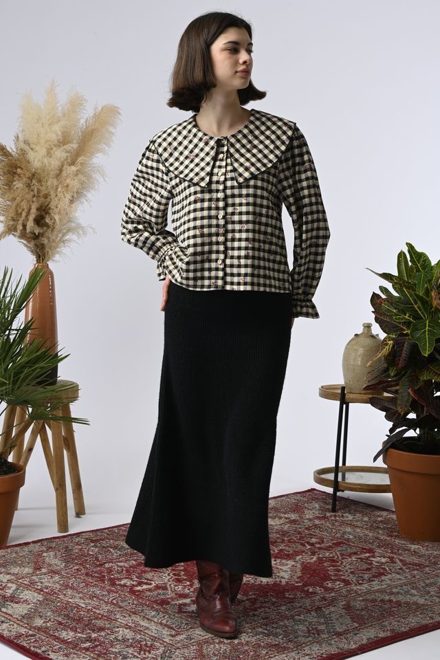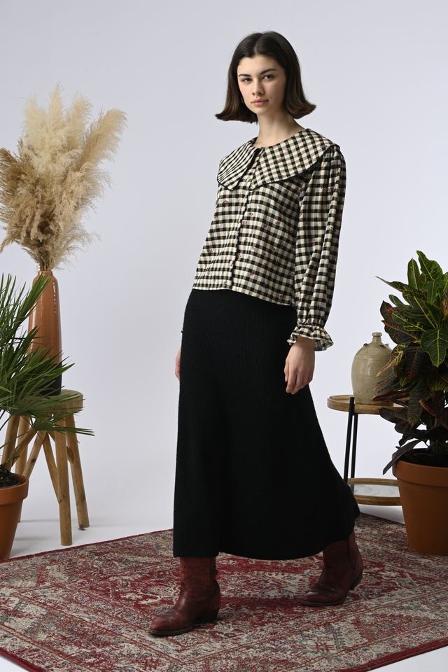Kid elegant blouse-shirt with a cape collar, puffed sleeves, and a flowing cut for a feminine and modern look. The Kid blouse-shirt is an elegant piece that adds a touch of modernity and femininity to your wardrobe.