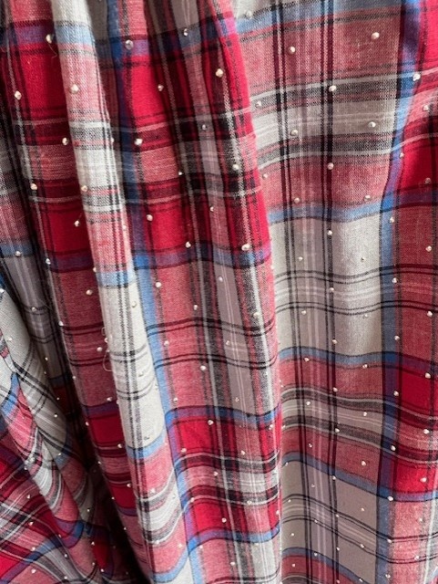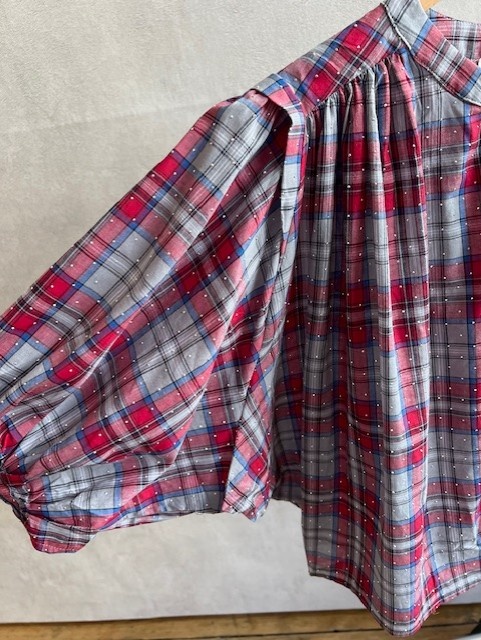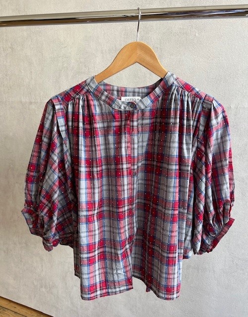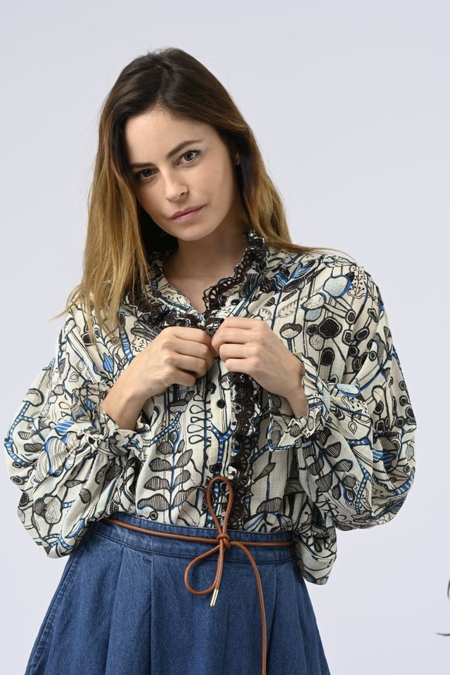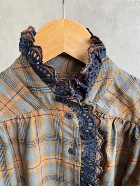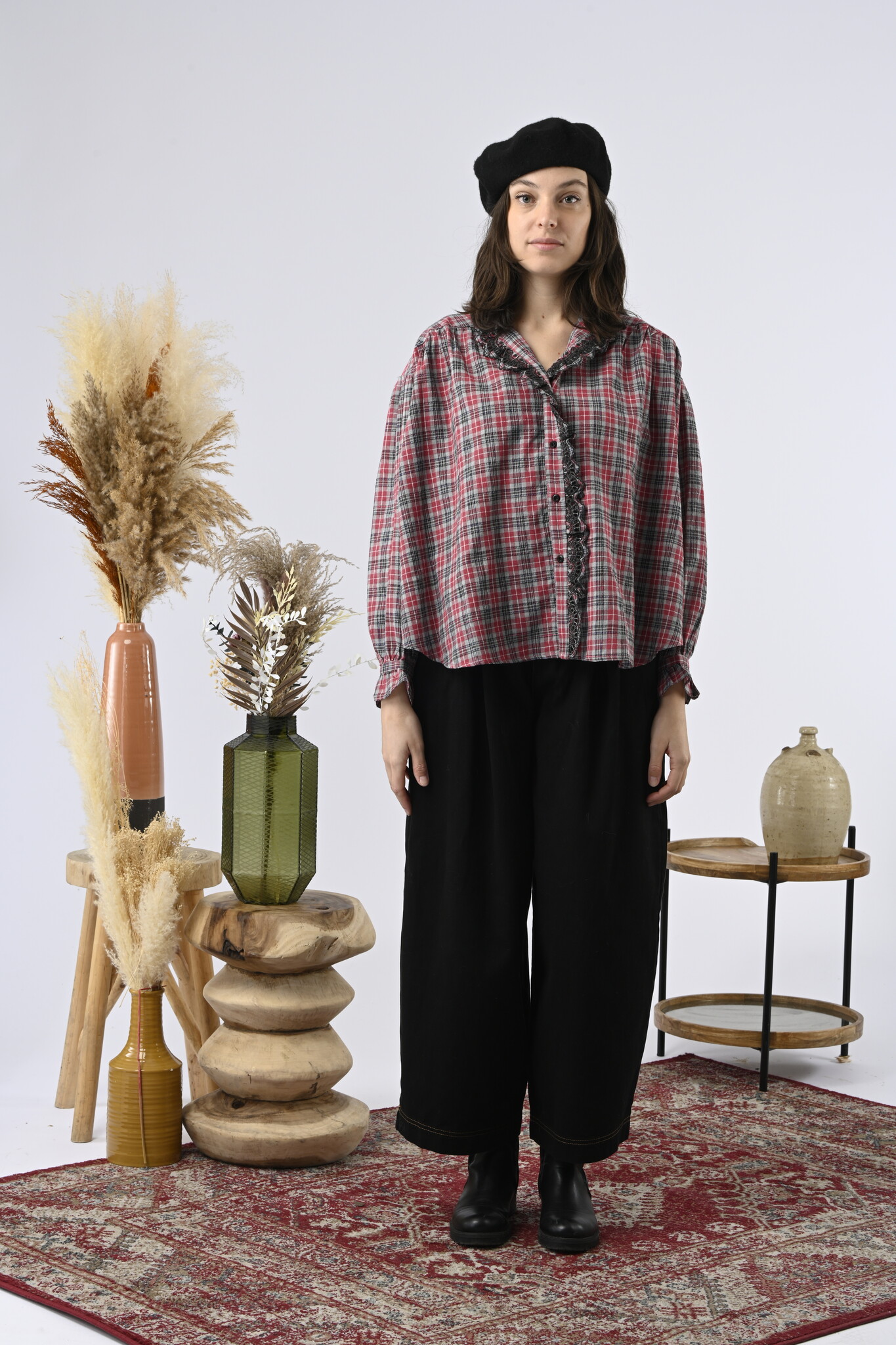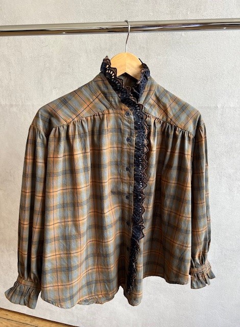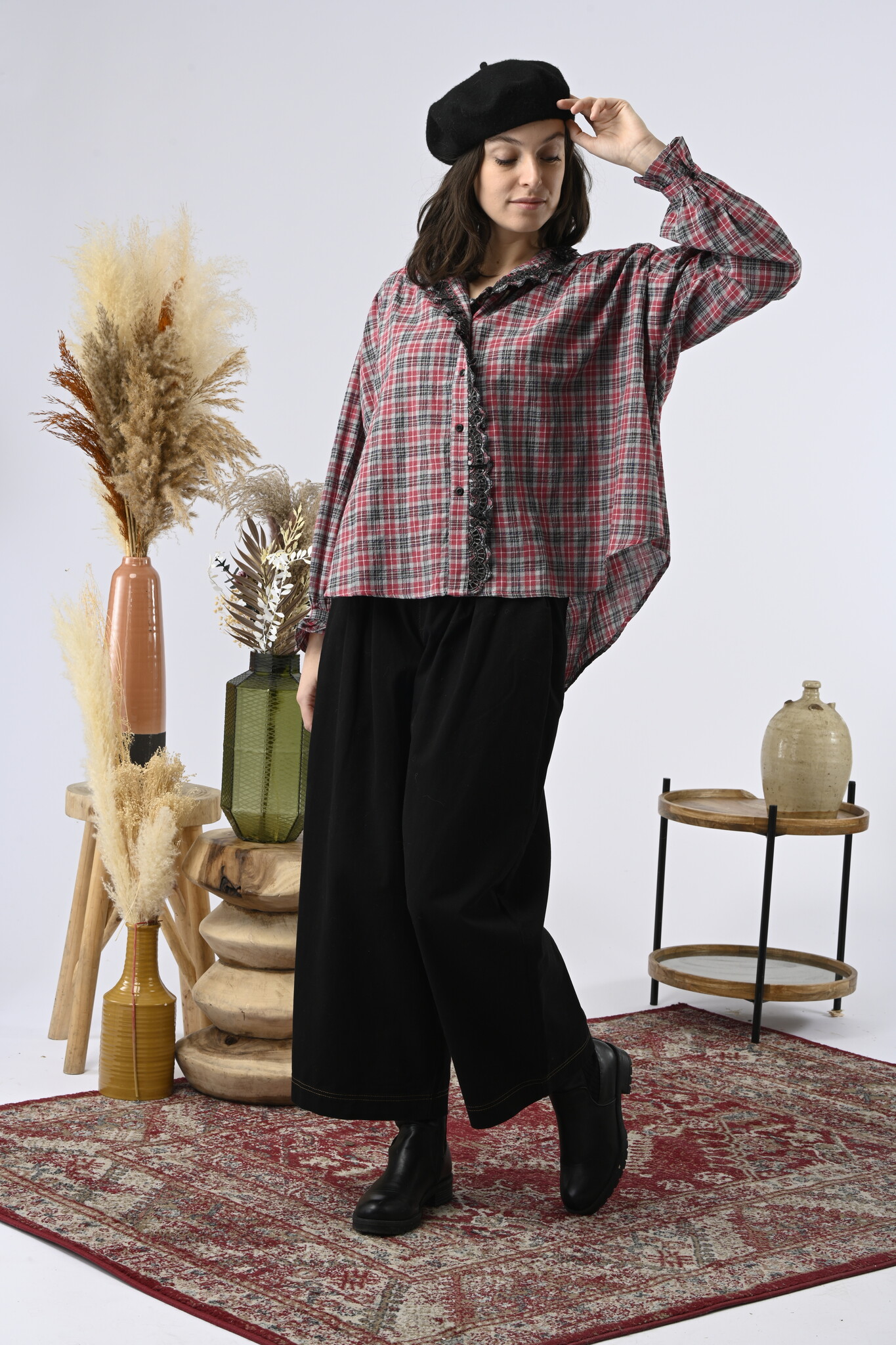 An elegant shirt with a refined twist: collar and buttoned placket highlighted with lace on the grey and mustard style for a feminine touch on checked or graphic prints. Grandad collar on the red check designs.