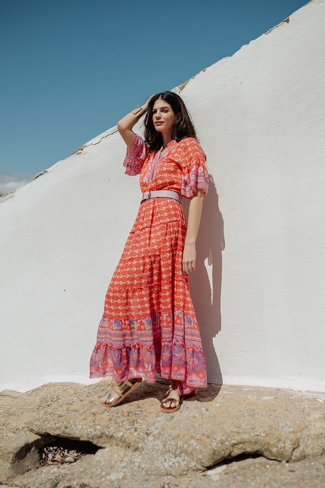 - Long dress in coral red color made of lightweight fabric with print