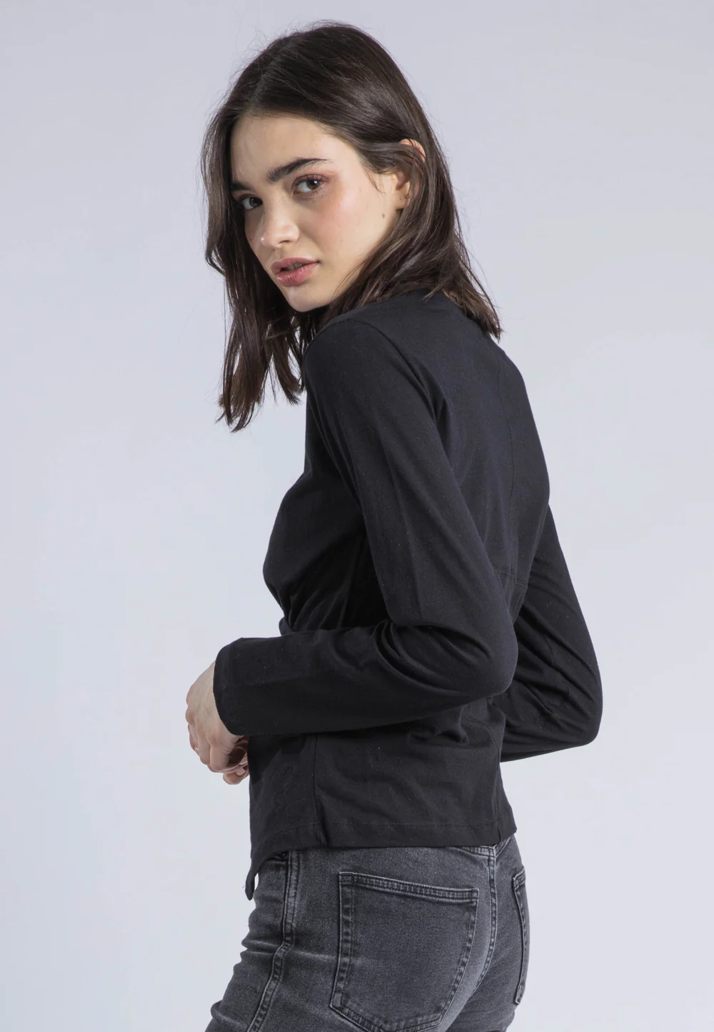 The Time top is a fitted tee in black featuring drape detailing at the front hem, adding a twist to this easy basic. With a regular fit, crew neckline, and long sleeves, it's hip-length and made from soft cotton jersey.