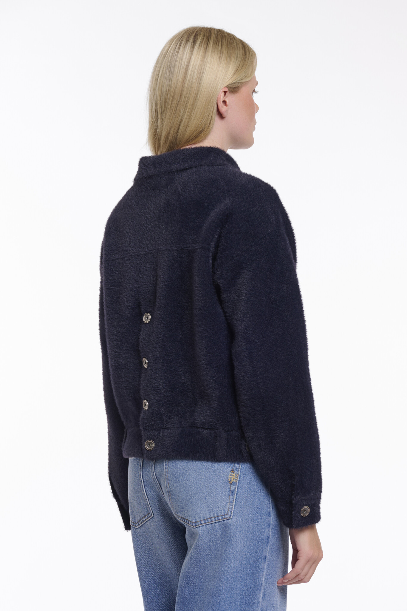 - This short jacket features a contemporary boxy silhouette, a flat collar, a button closure, two open front pockets, a button closure on each cuff and button details on the back.