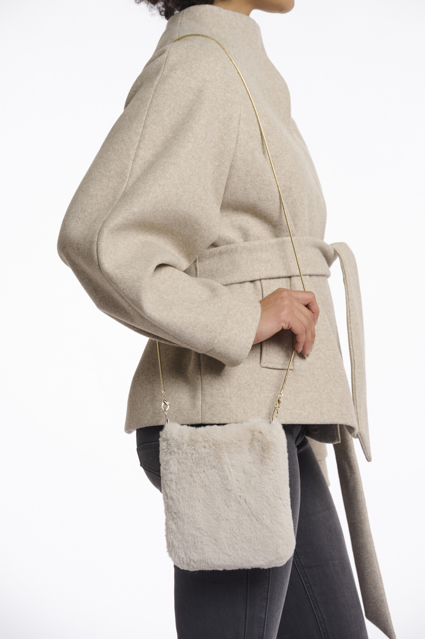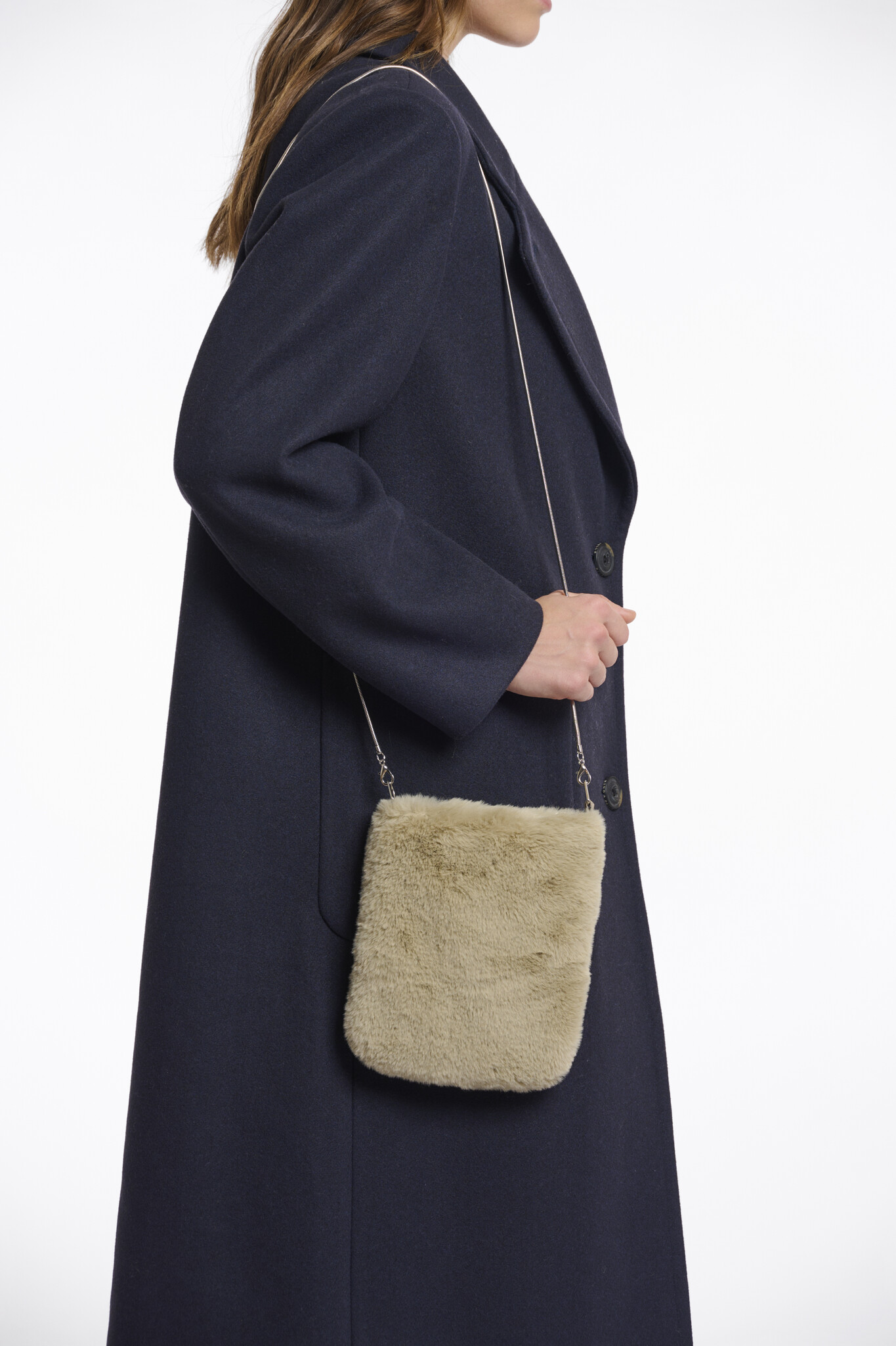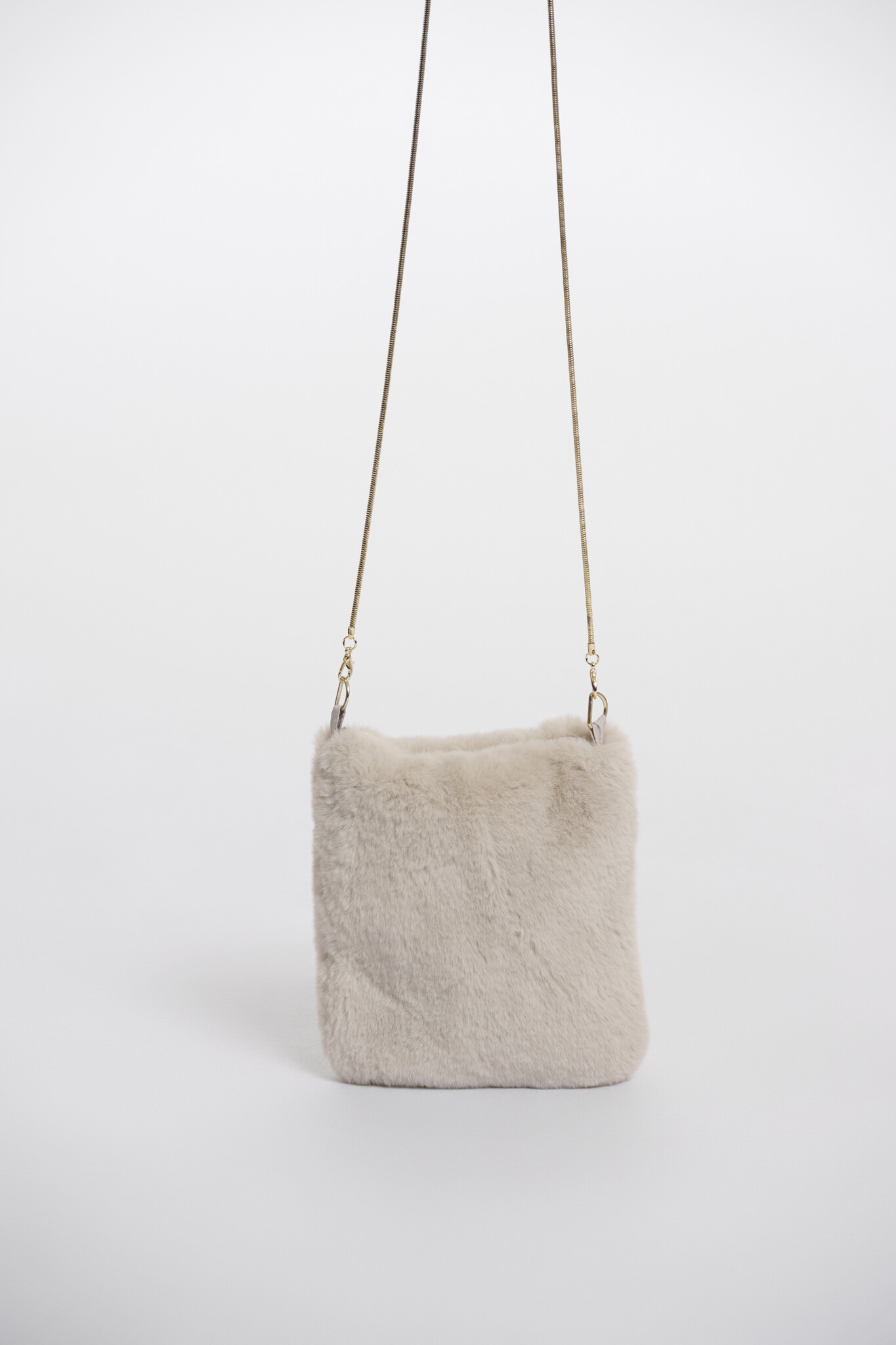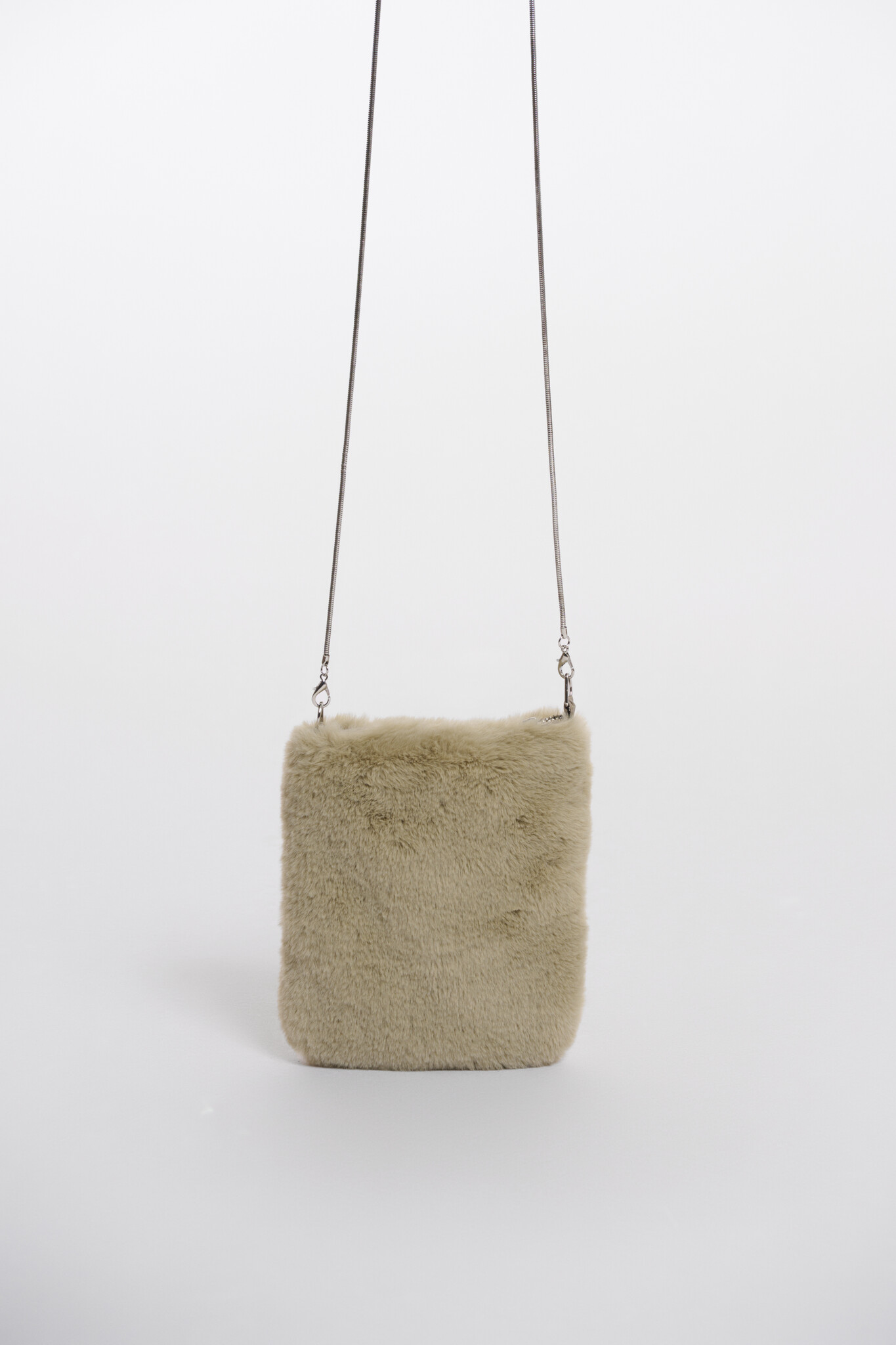 Small shoulder bag with a long metal handle. Detach the thin metal cord with its clasps. This eyecatcher features a zipper closure with a contrasting piping and a faux-fur top fabric.