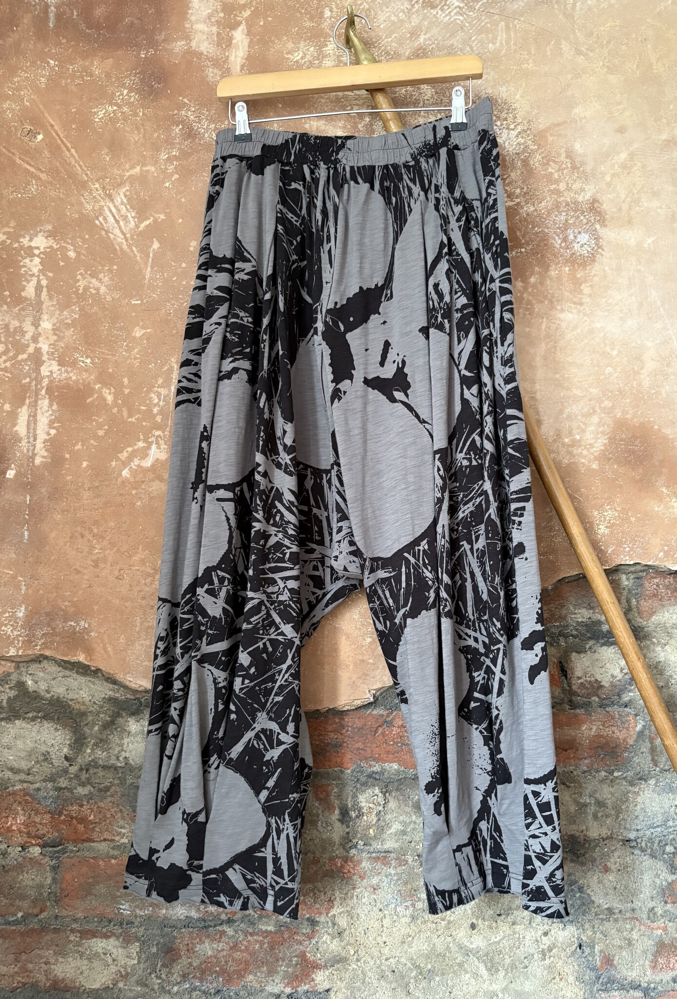 Drop crotch cotton jersey pants with elasticated waist and all over print.