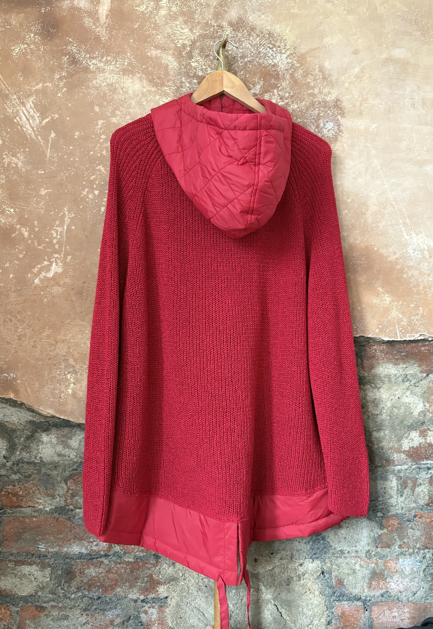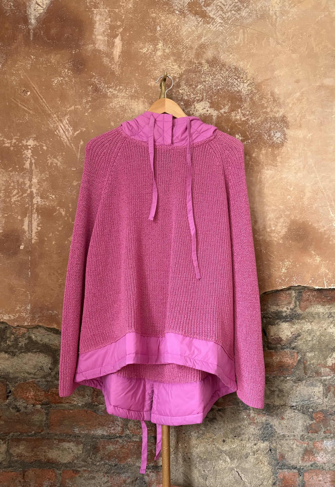 Hip-length linen knit sweater with padded nylon insert and the coolest of hoods.