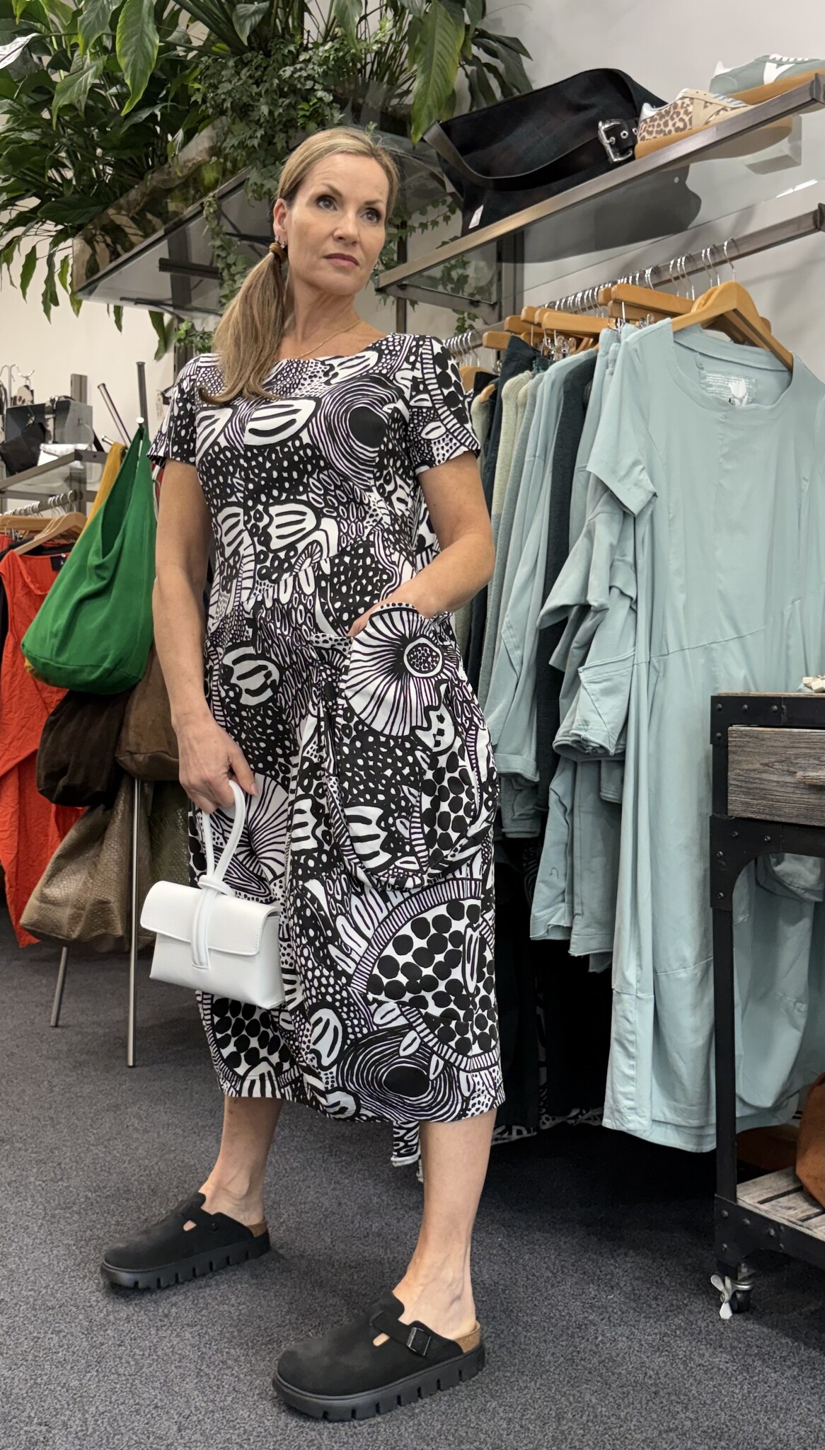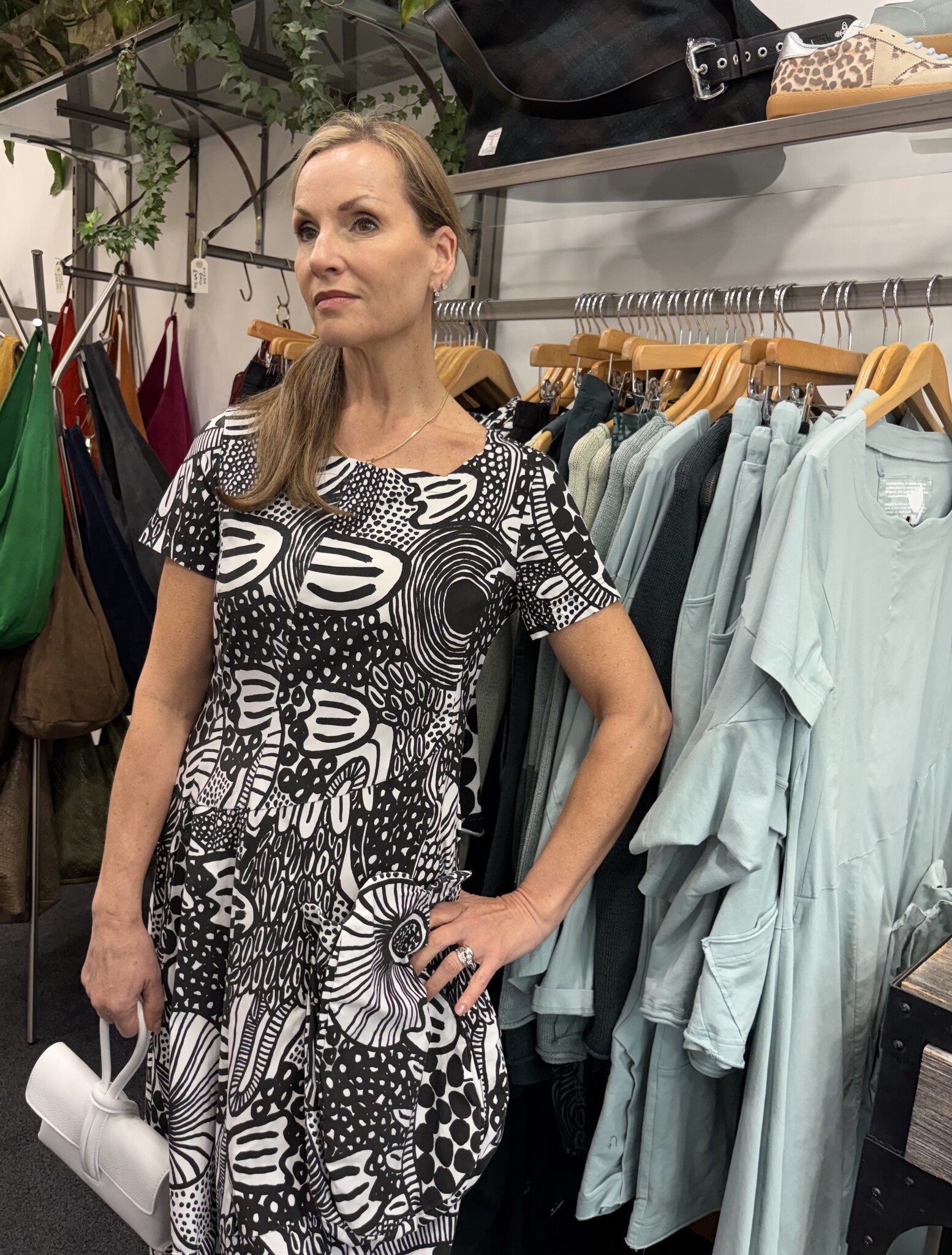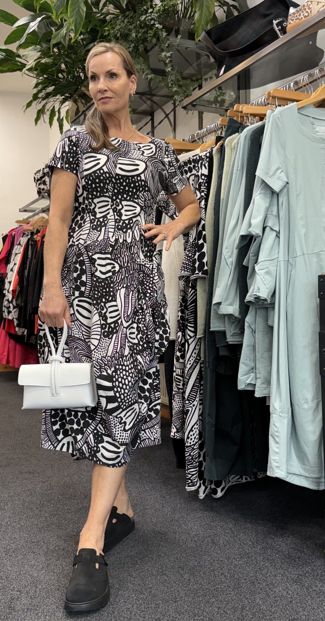 Banana shape techno dress in a black and white abstract print.