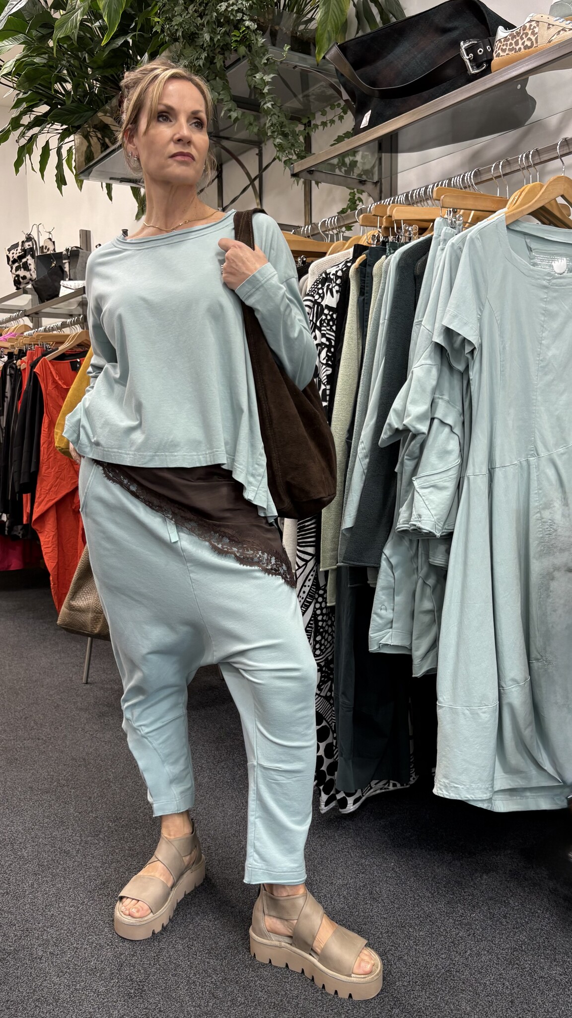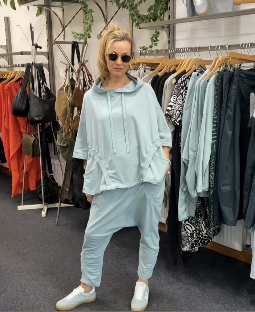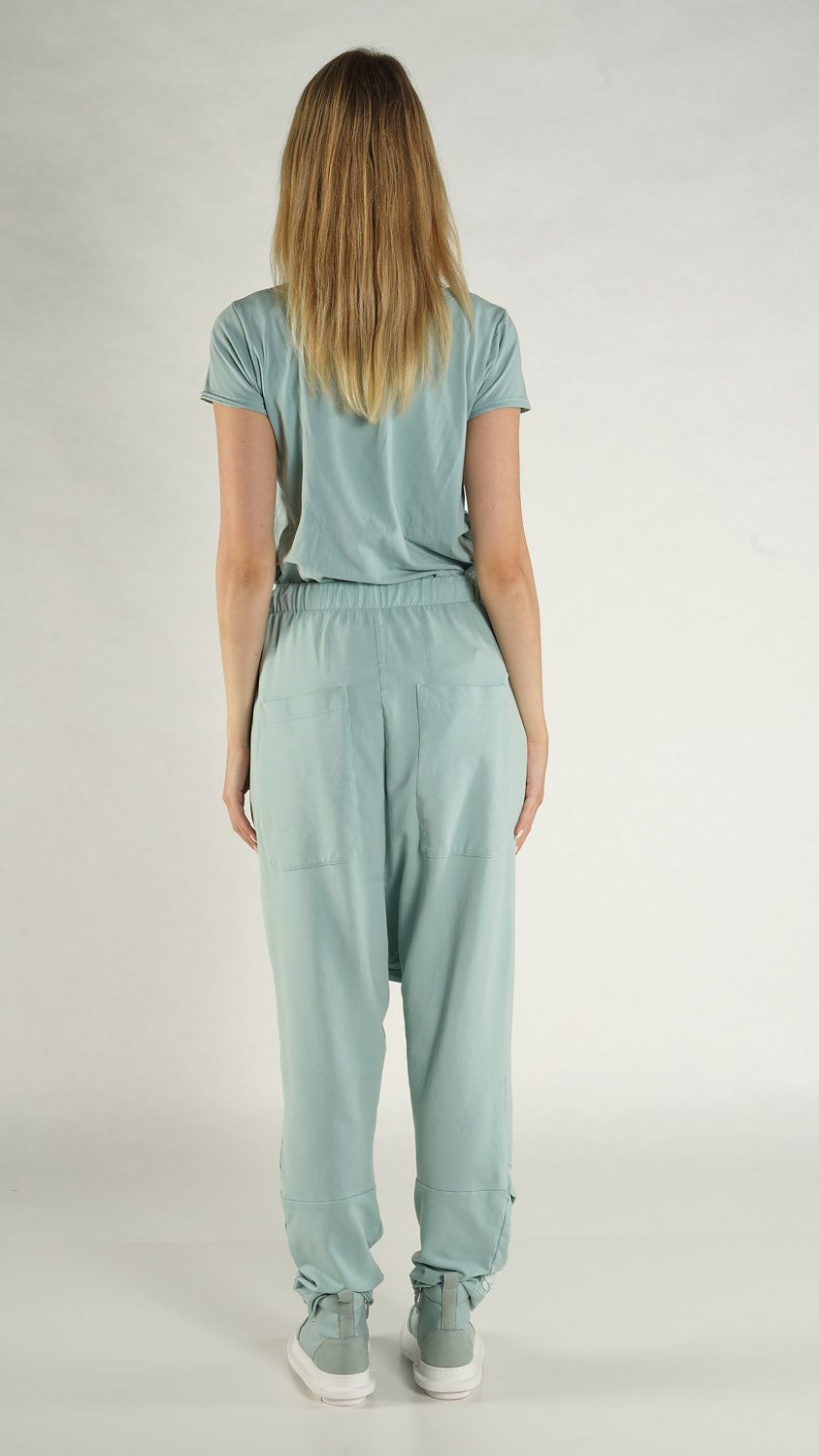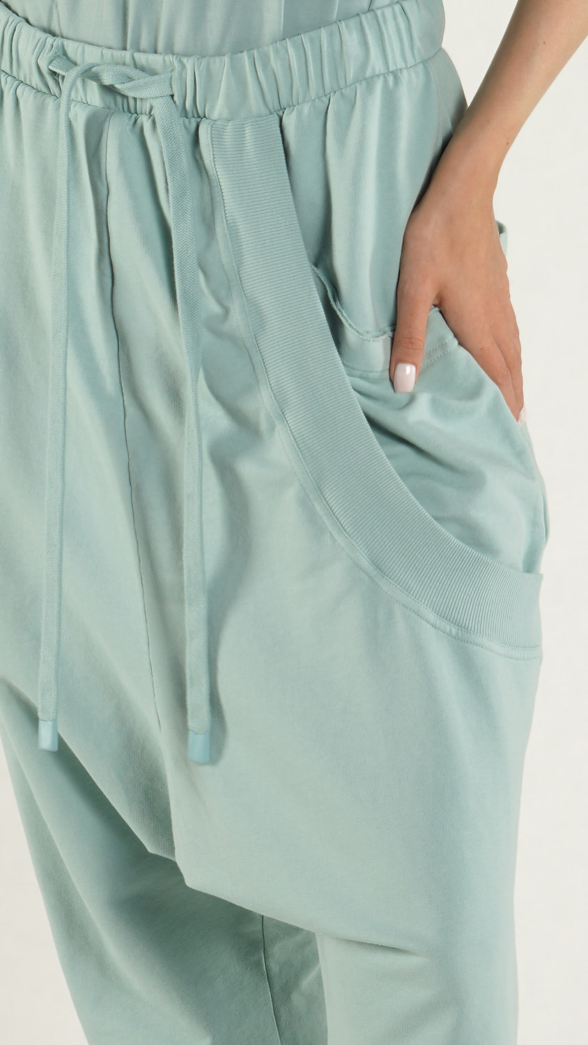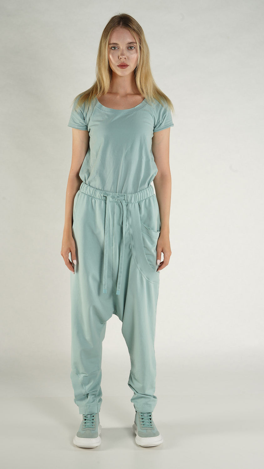 French terry pants with low crotch design.