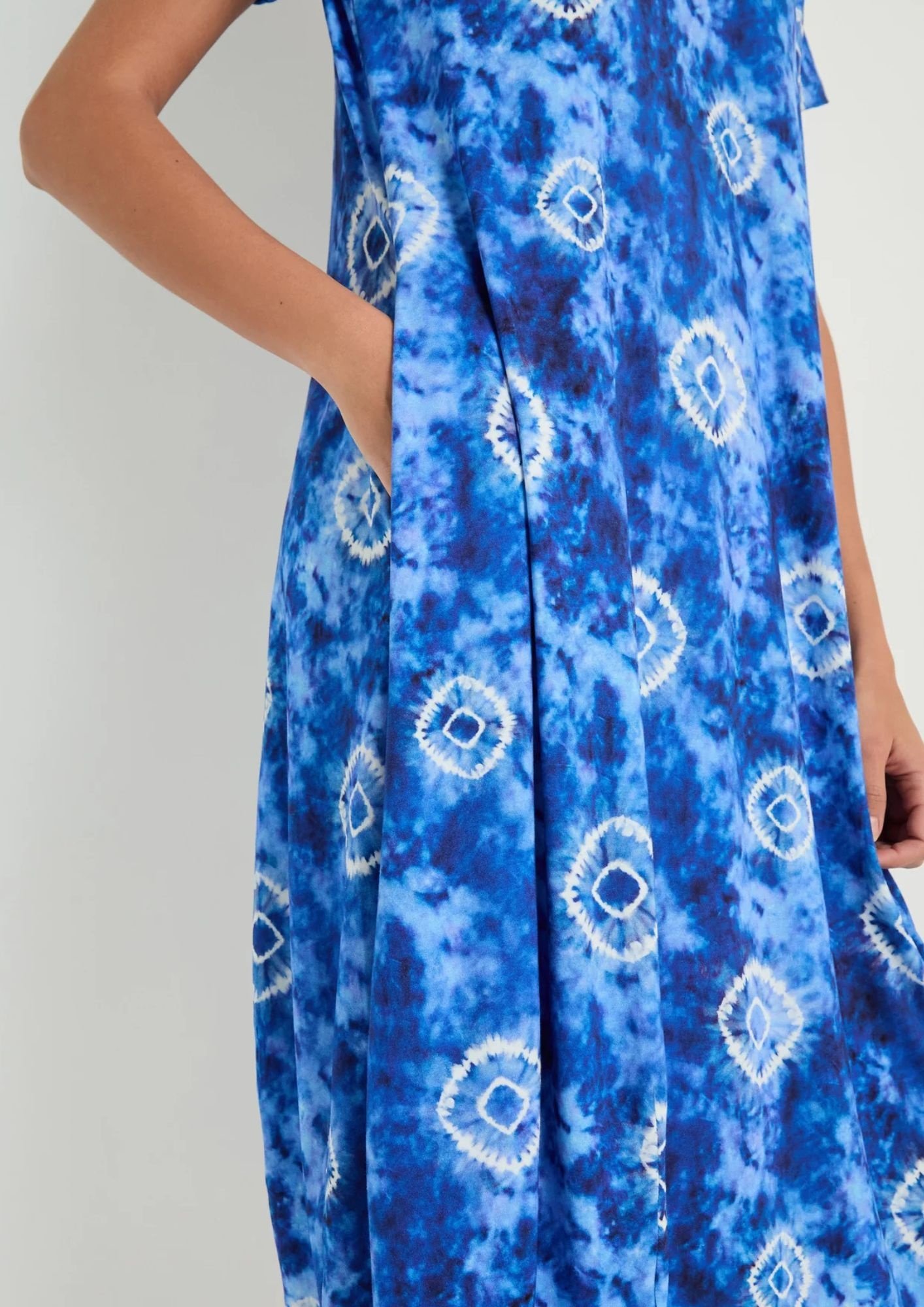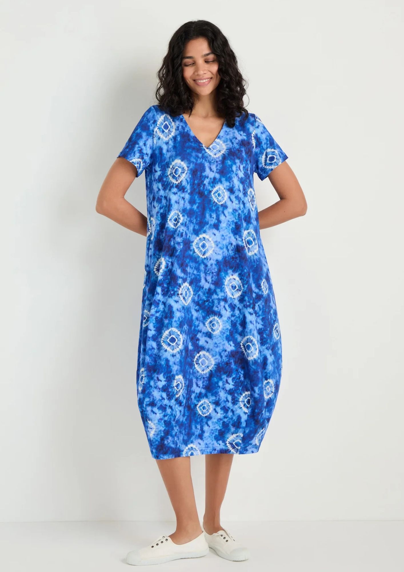 The Sahara Tie Dye Circles Bubble Jersey Dress pairs expressive pattern with one of Sahara's most recognisable silhouettes. Cut from fluid viscose jersey with gentle stretch, the spaced tie-dye circles bring elevated bohemia and depth to the rich blue.