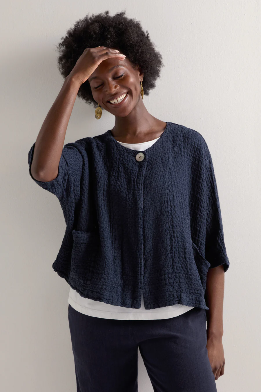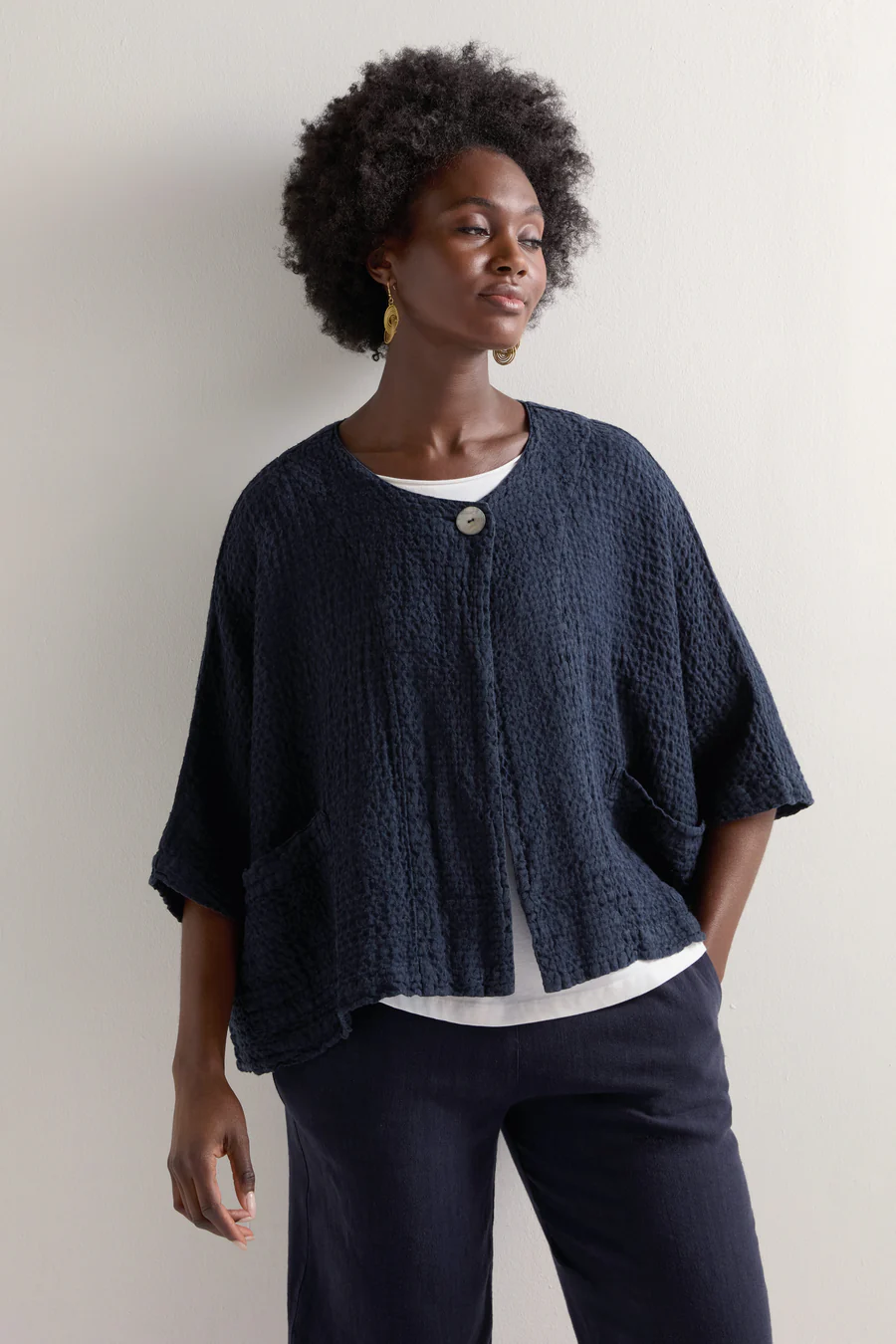 Elevate your layering game with the Waffle Linen Boxy Jacket. Crafted from textured linen, this jacket offers a rich, tactile feel that adds depth to any outfit. Its oversized, boxy fit creates a relaxed silhouette, making it a versatile piece.