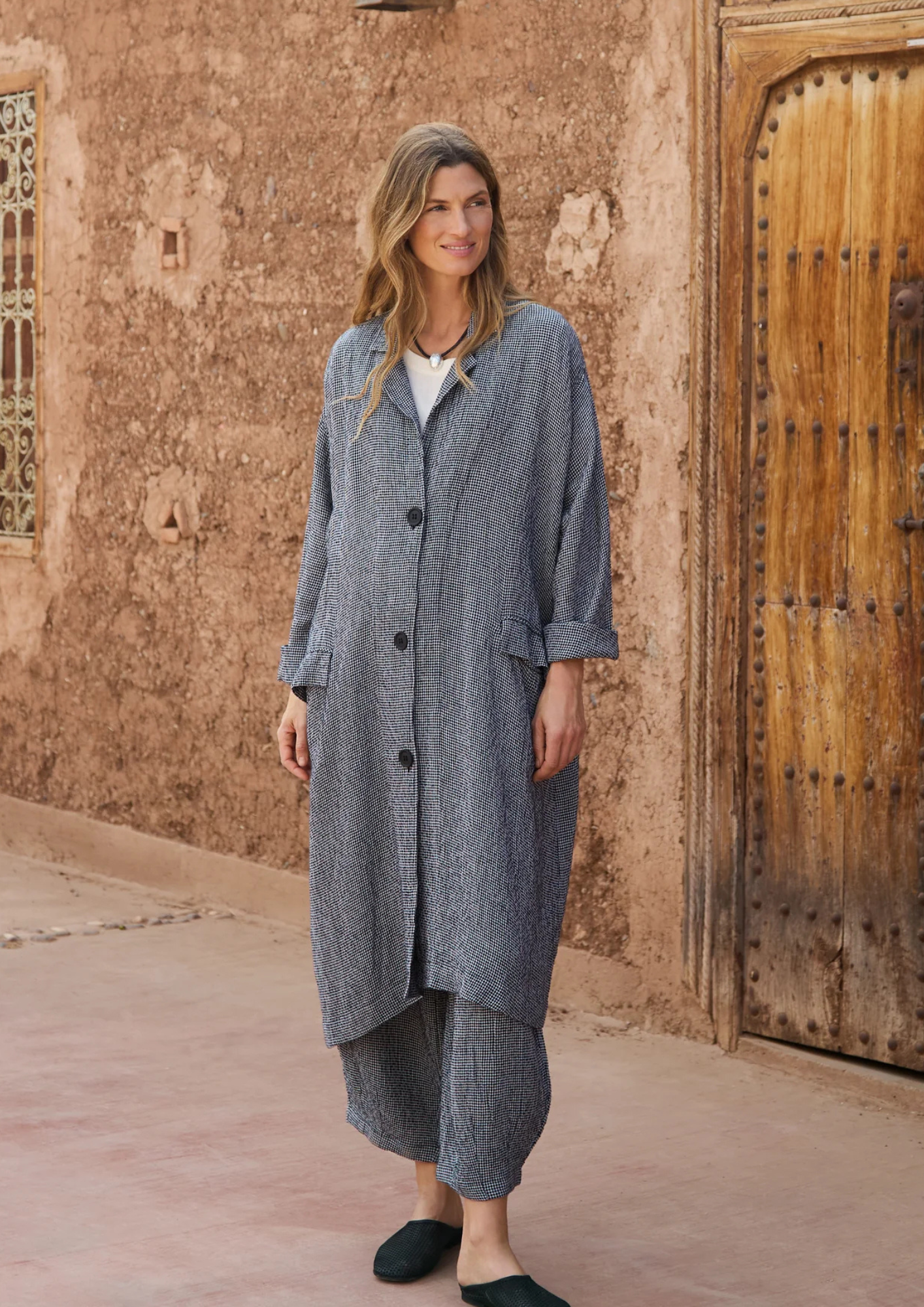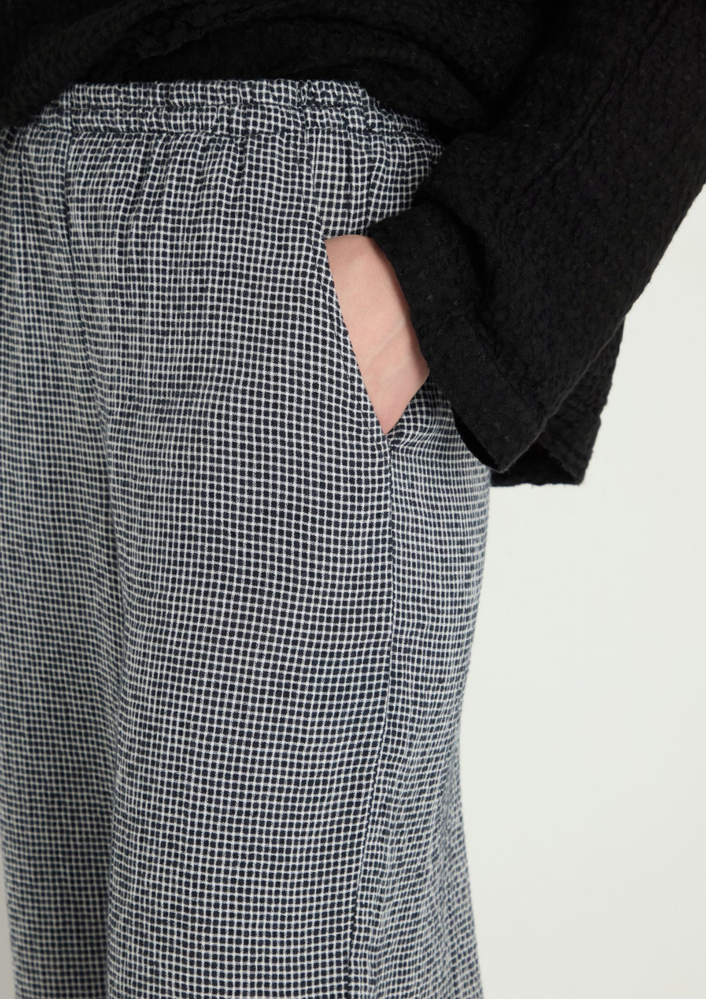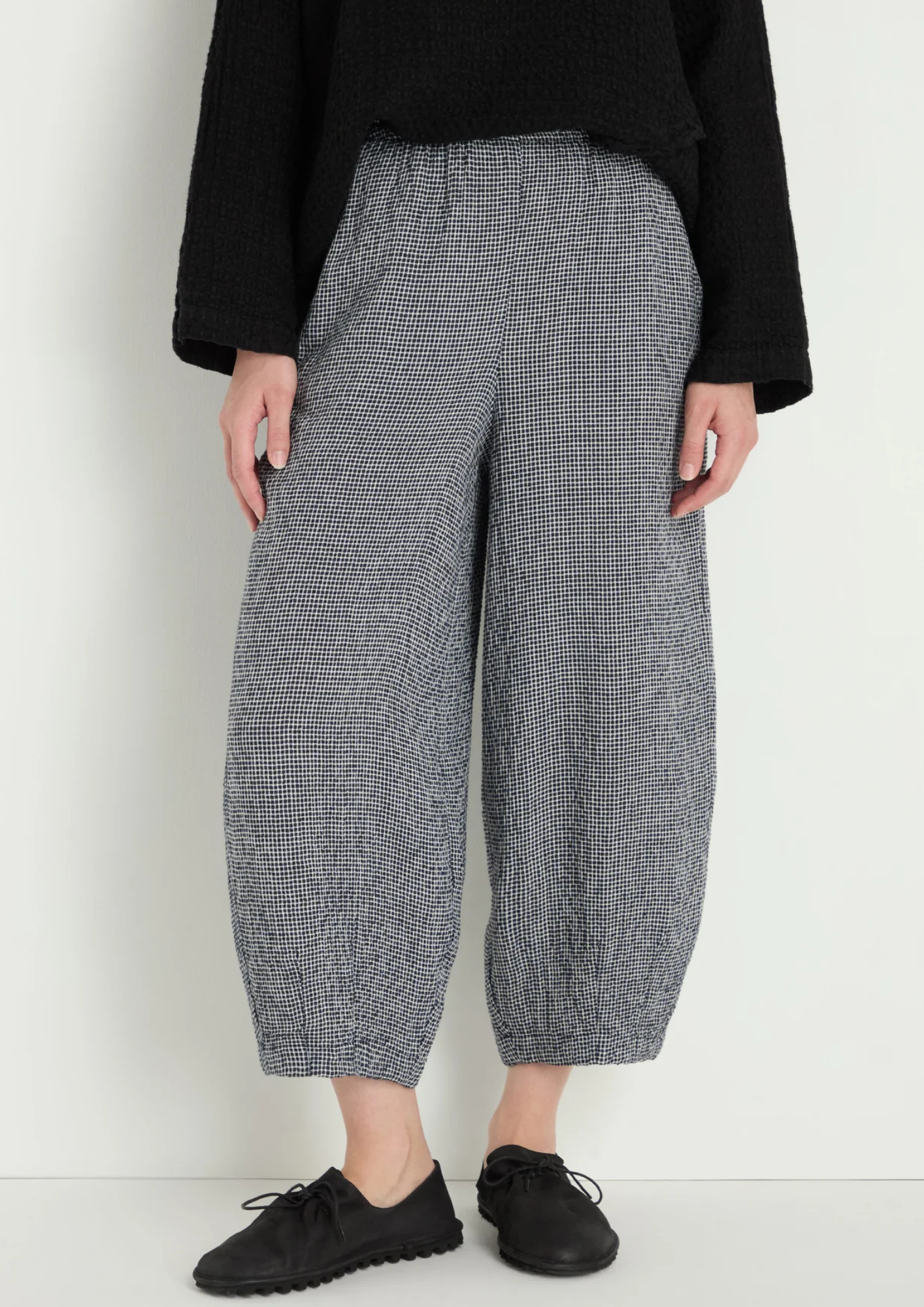 The Sahara Micro Gingham Linen Viscose Bubble Trousers in a refined micro gingham weave, offering subtle pattern with everyday ease.