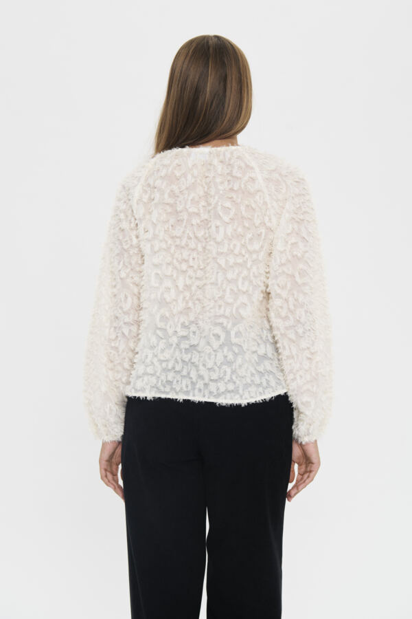 Textured long sleeve blouse featuring a subtle raised pattern throughout, designed with a regular fit silhouette. Rounded neckline with a small, single-button closure at the collar.