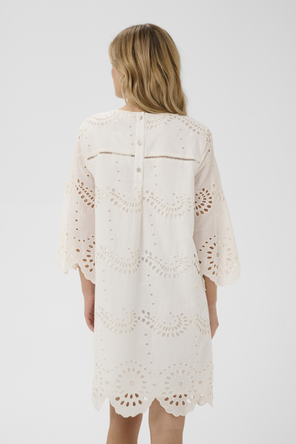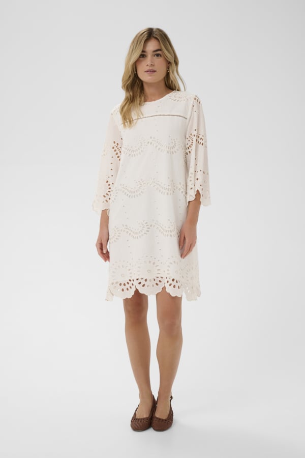 This dress features a straight, loose silhouette with wide three-quarter sleeves and a round neckline. Eyelet cut-outs create an airy texture across the dress, with scalloped edges on the sleeves and hem adding a distinct touch.