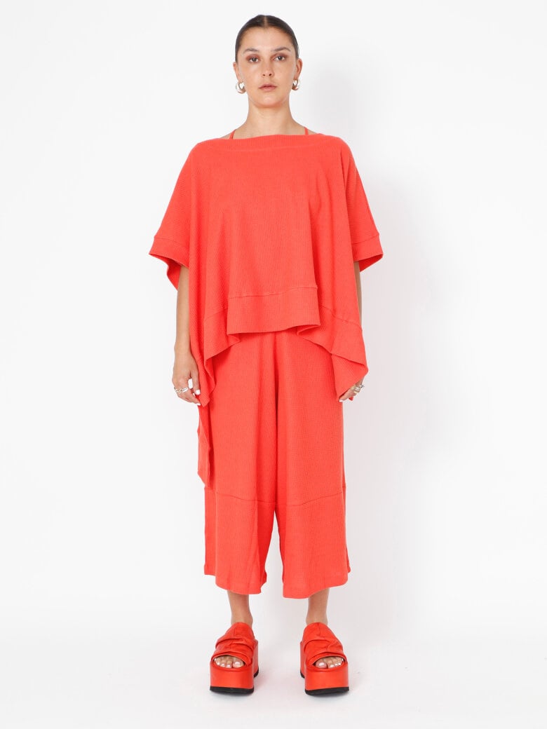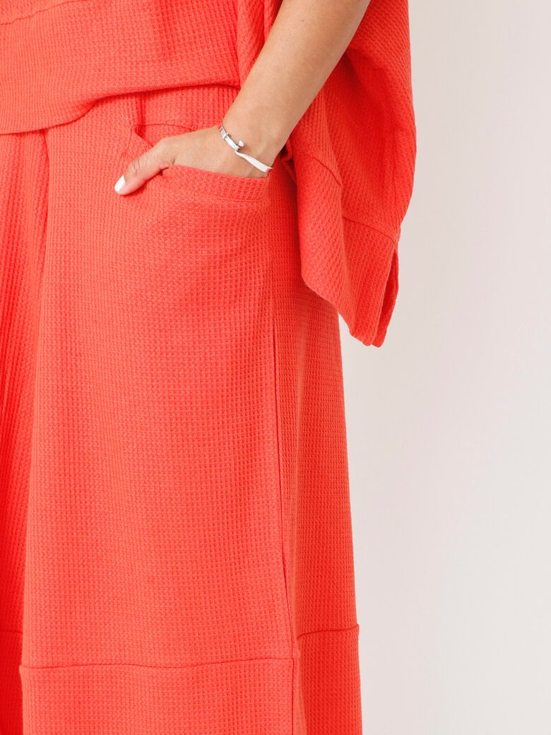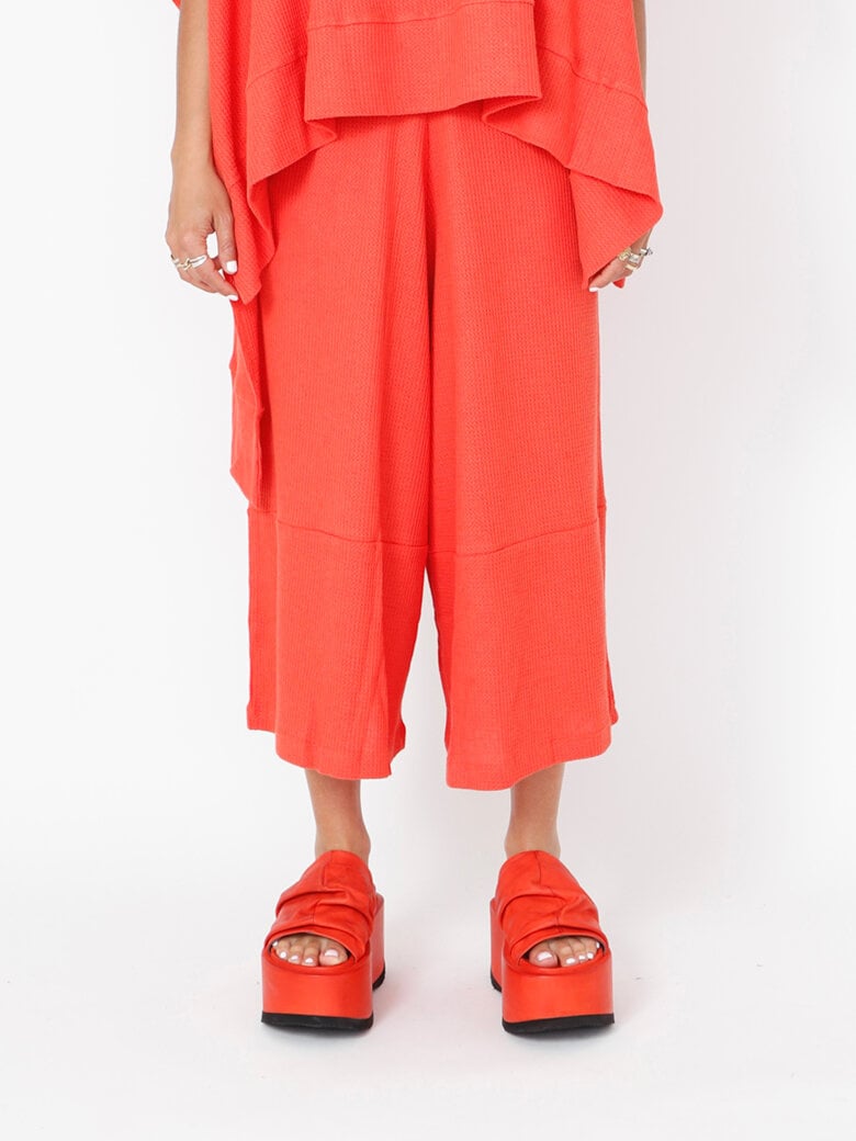 3/4-length trousers with wide legs, a wide elastic waistband, and pockets. Made from an exclusive cotton/linen blend with a beautiful textured finish.