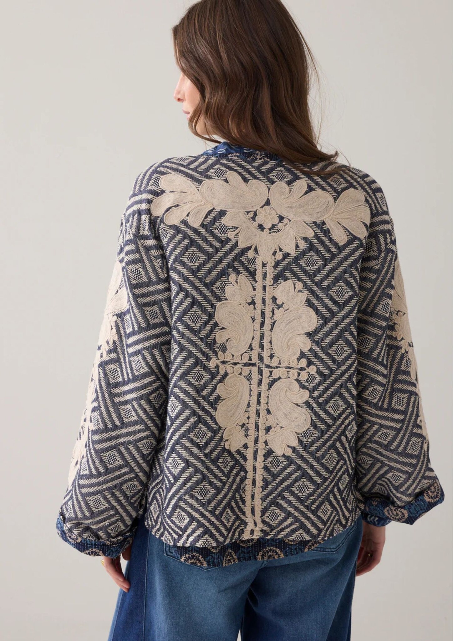Loose-fitting reversible jacket with a rich jacquard on one side and a block print on the other. The jacket has patch pockets, small side slits and is finished with fine embroidery on the sleeves and back.