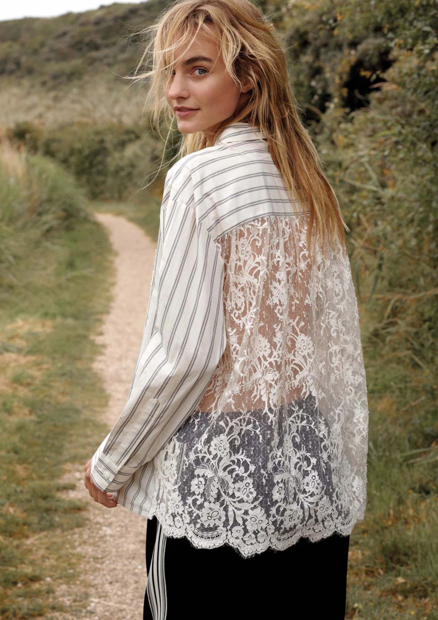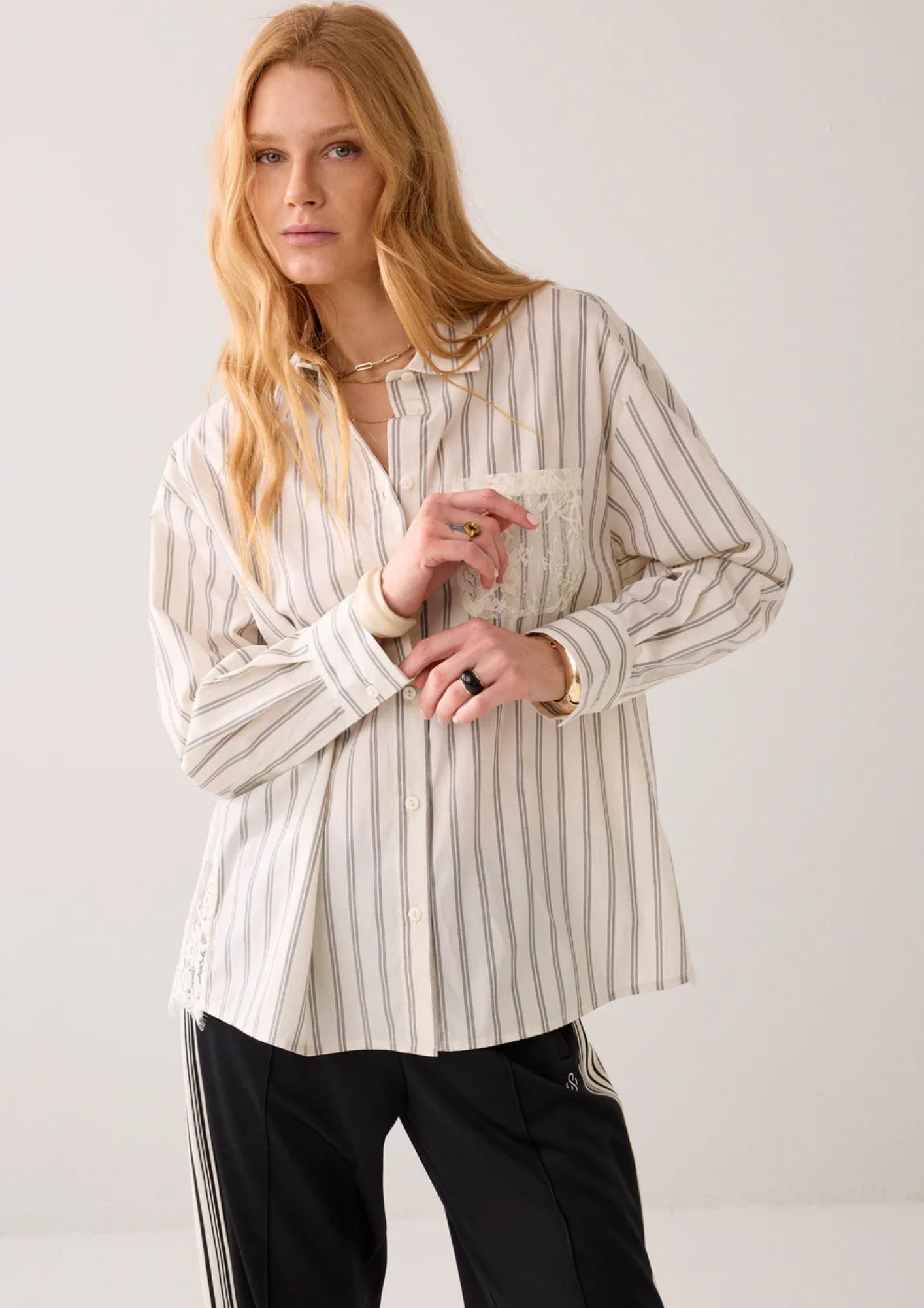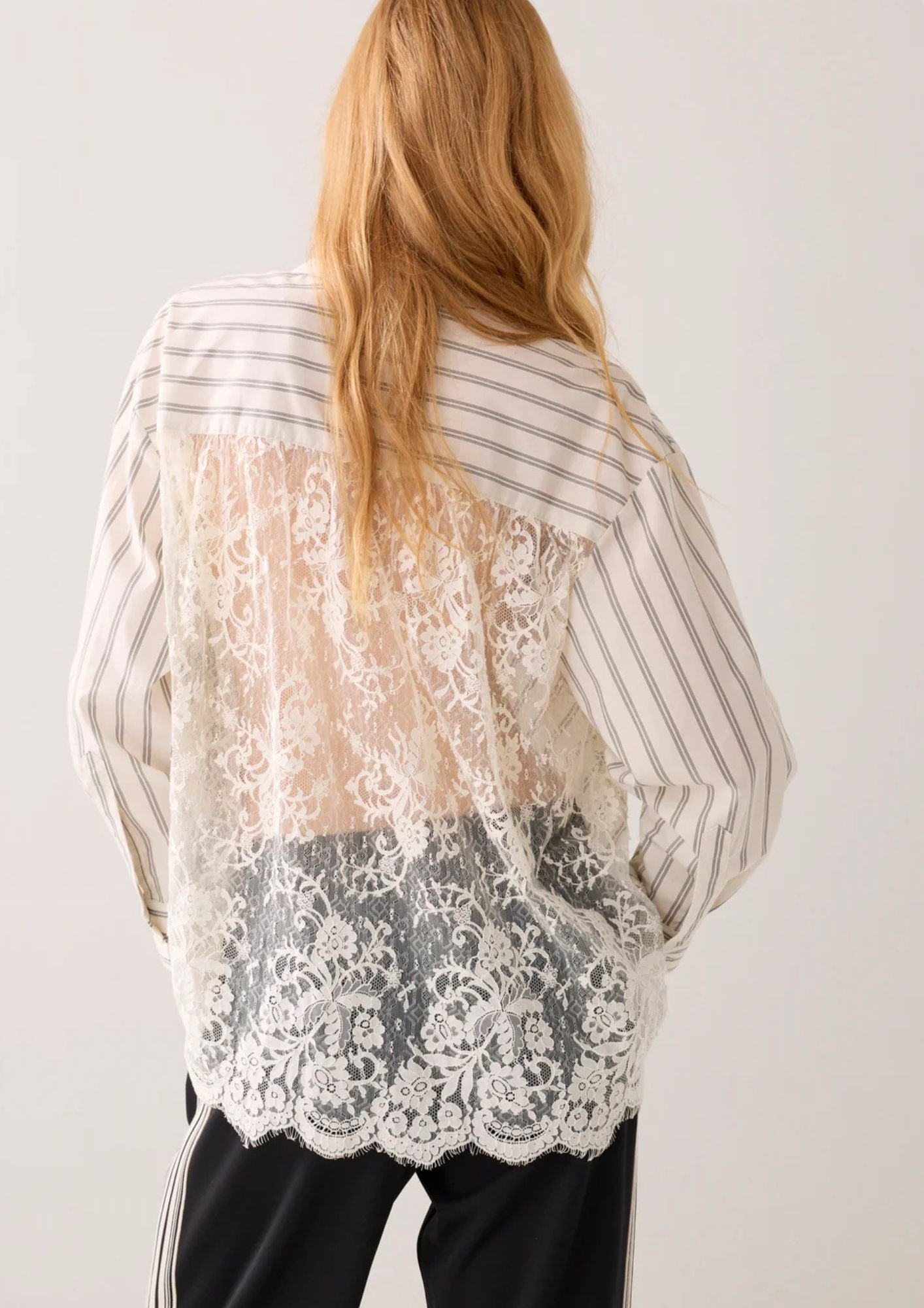 Loose-fitting shirt blouse in striped cotton with a transparent lace back. The chest pocket is also lace.