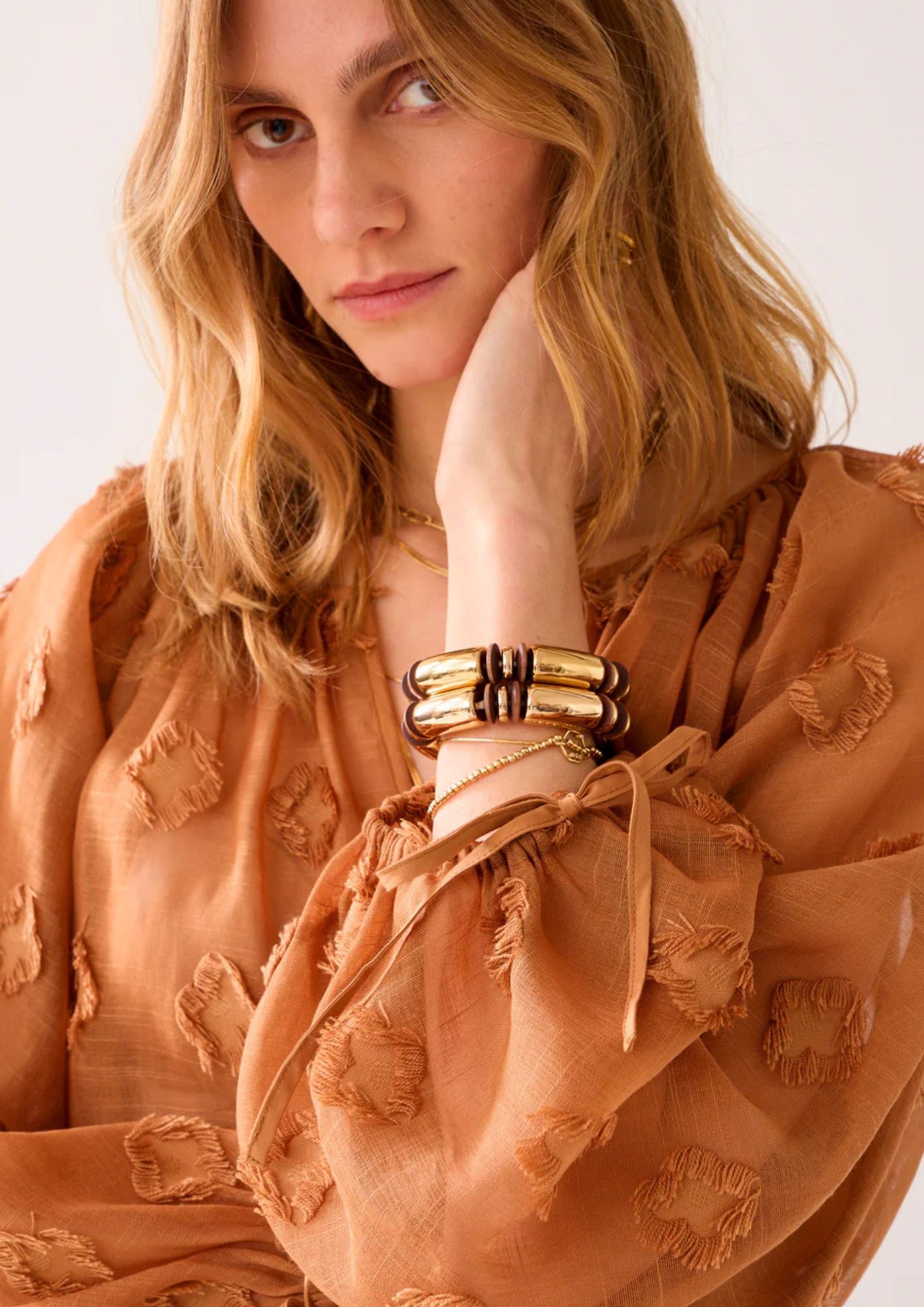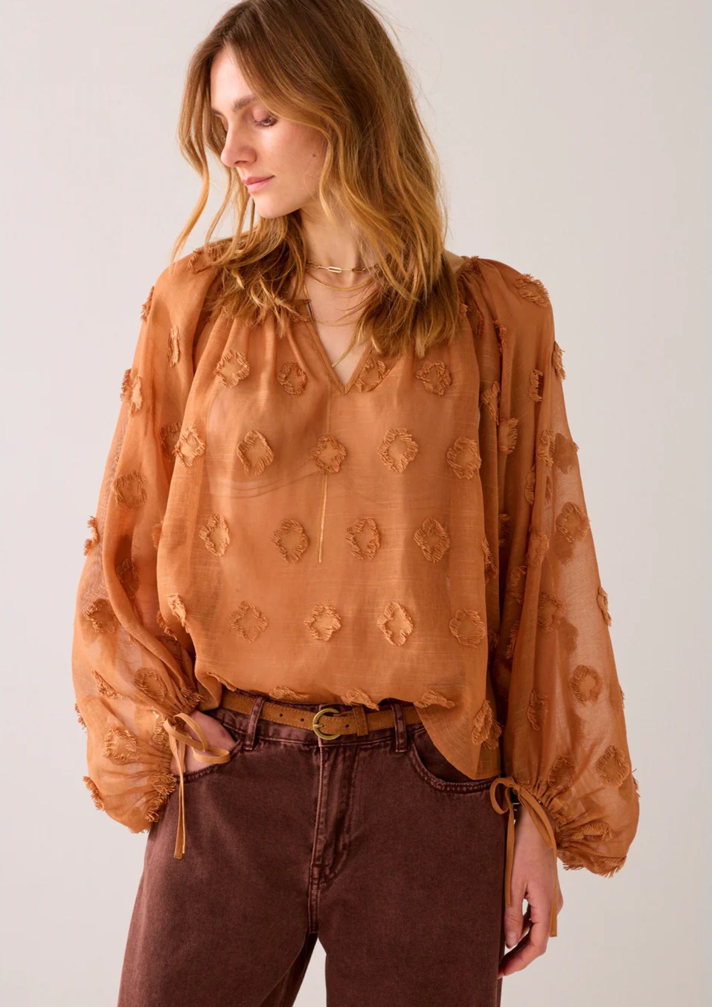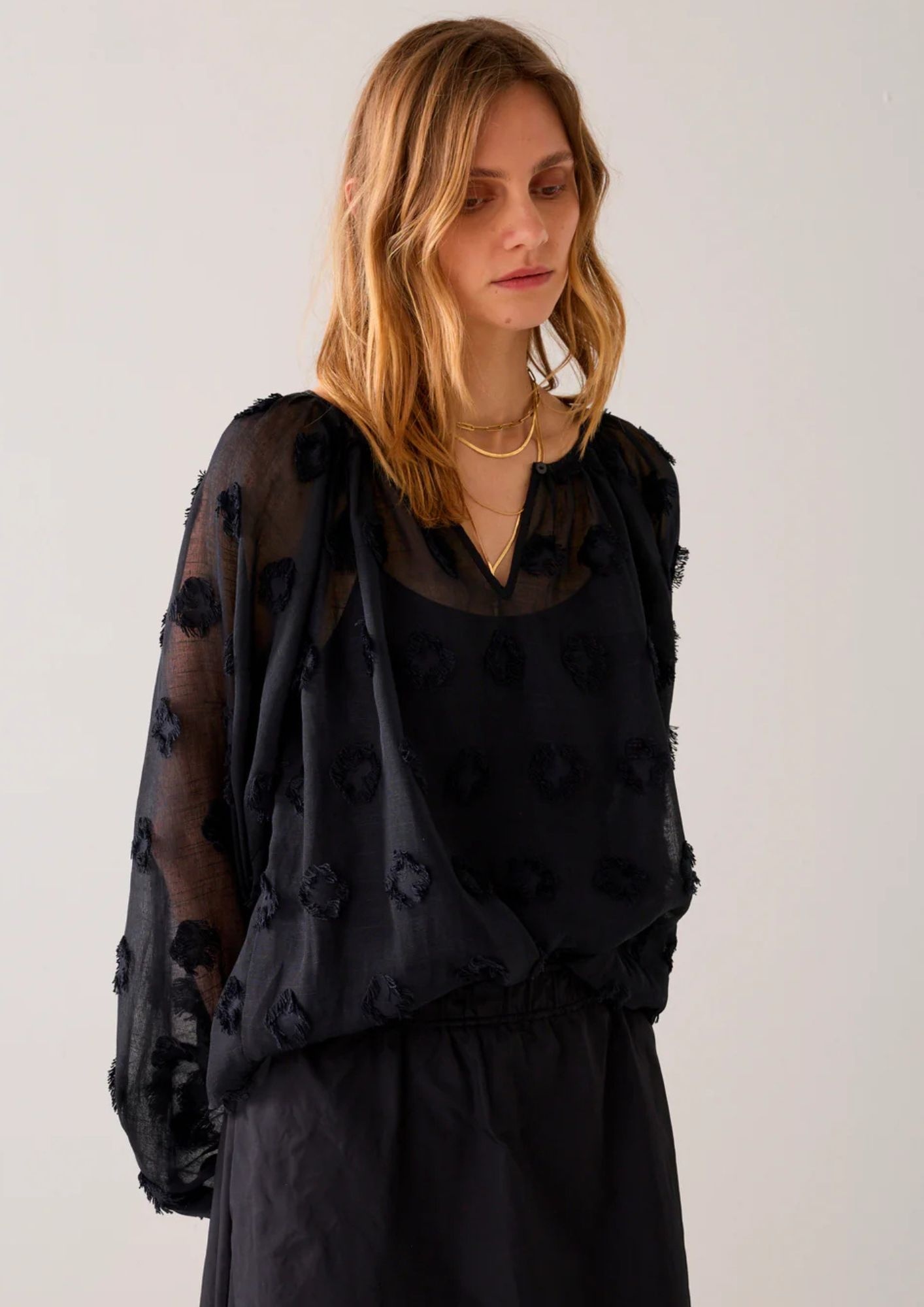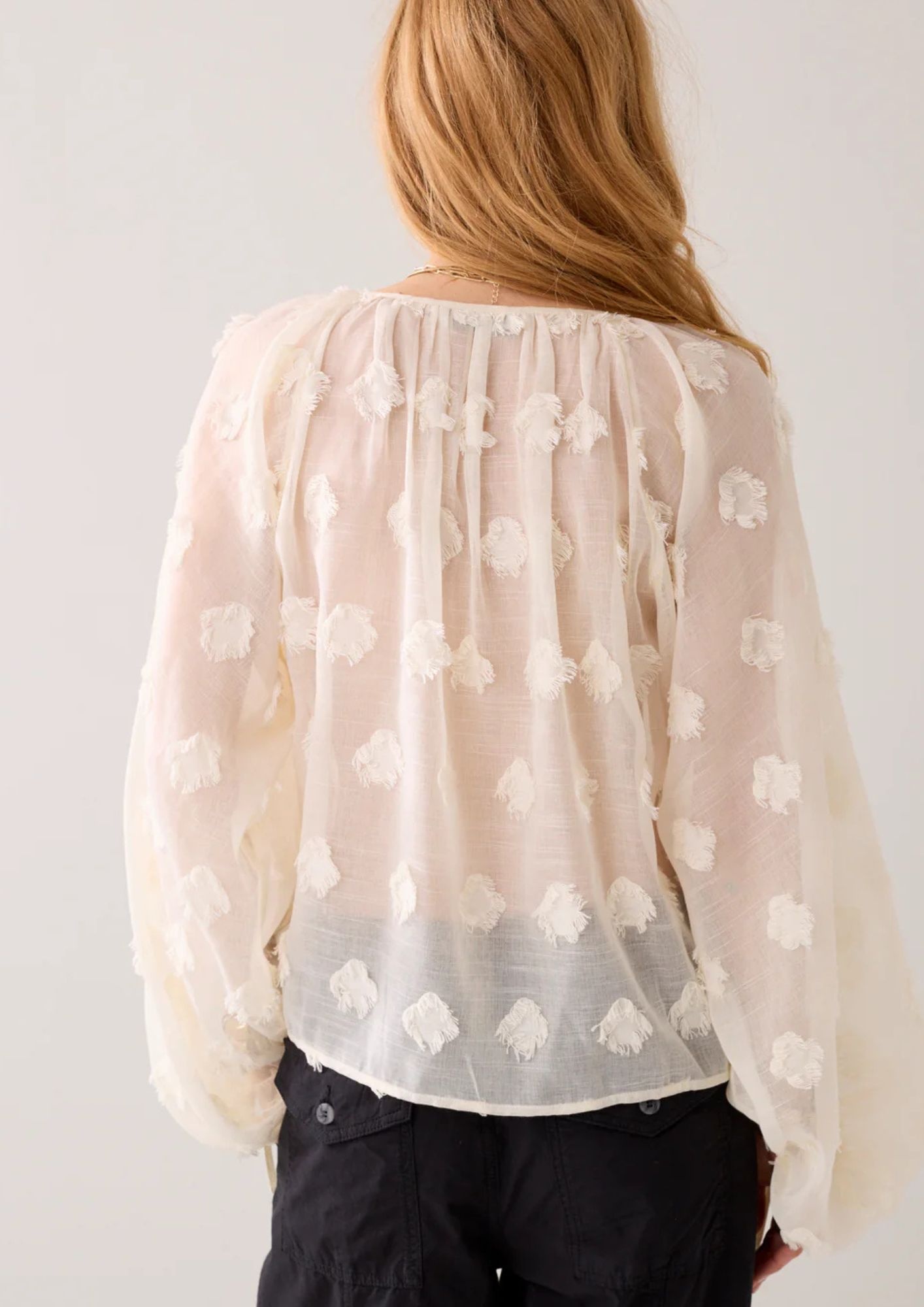 Oversized top in sheer fabric with playful 3D dot details. The top has balloon sleeves with a drawstring elastic band.