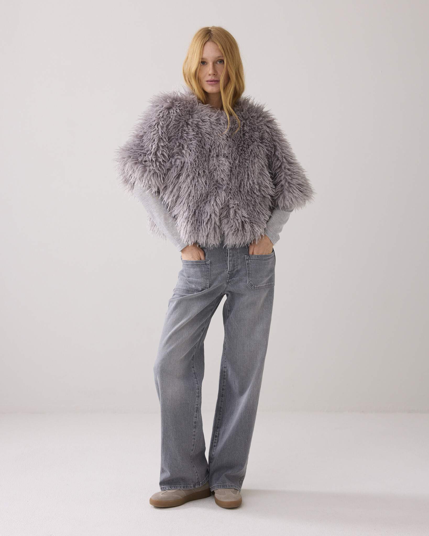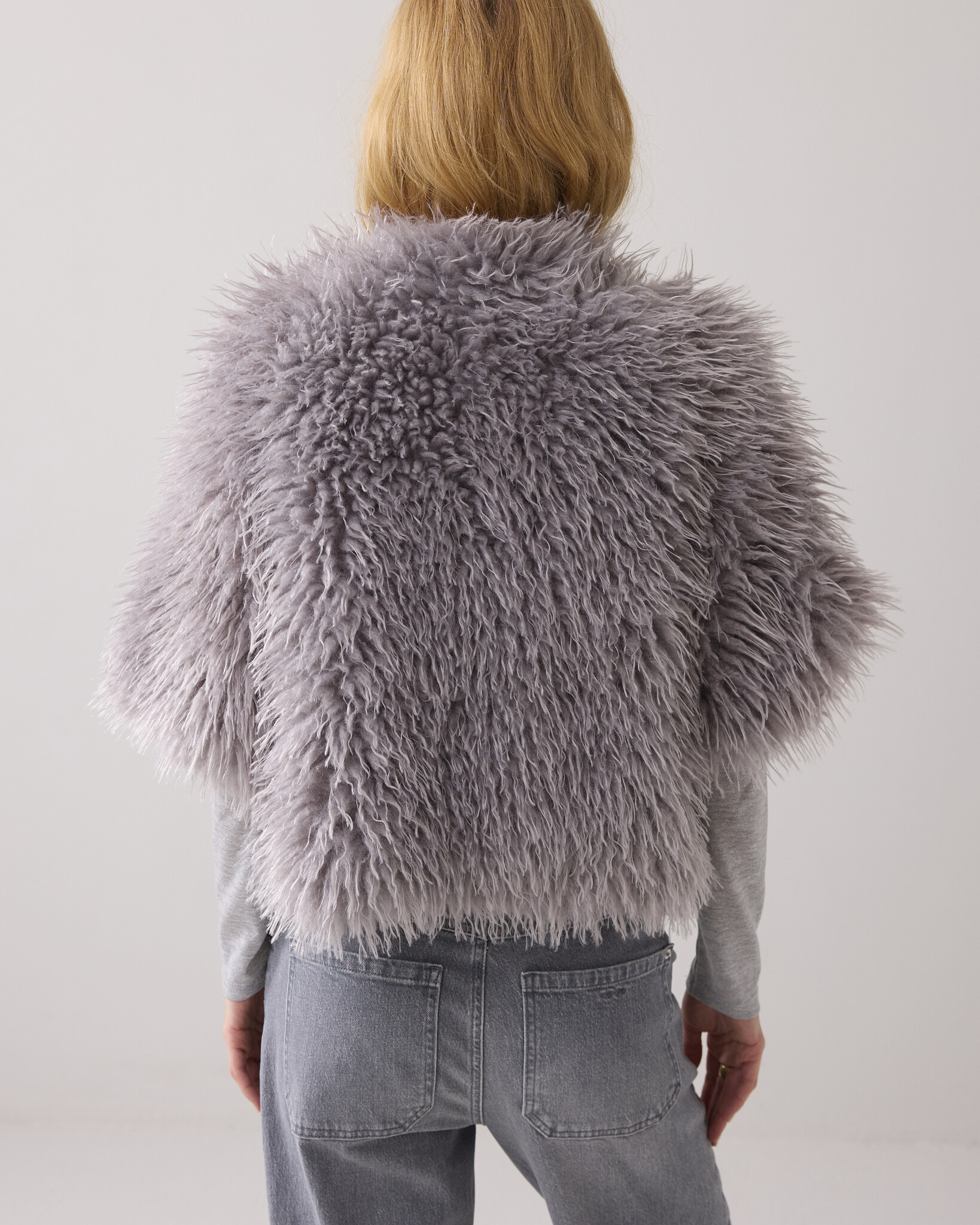 Short Afghan faux fur jacket with luxurious satin lining. The jacket has sleeves to the elbow and a button-down fastening.