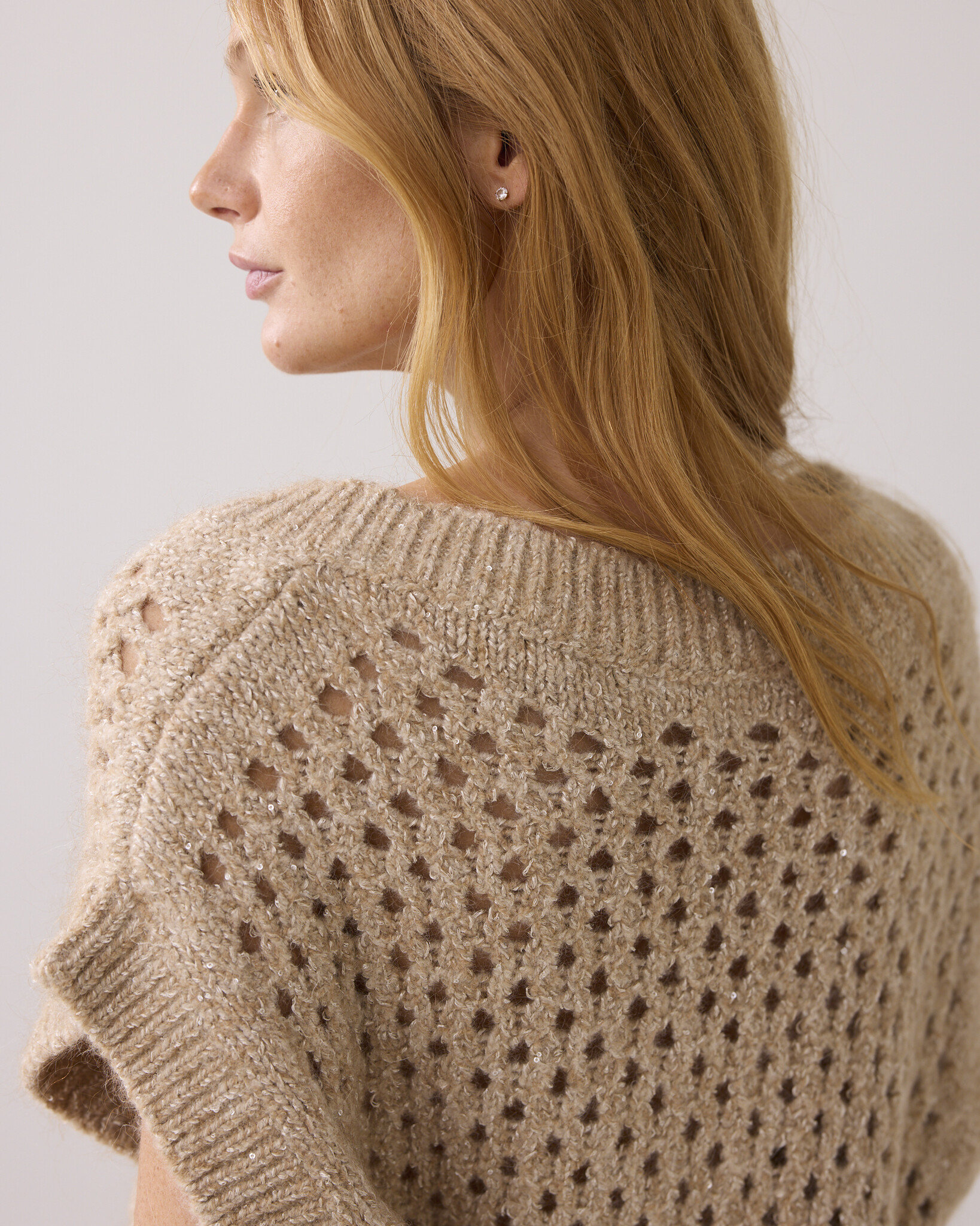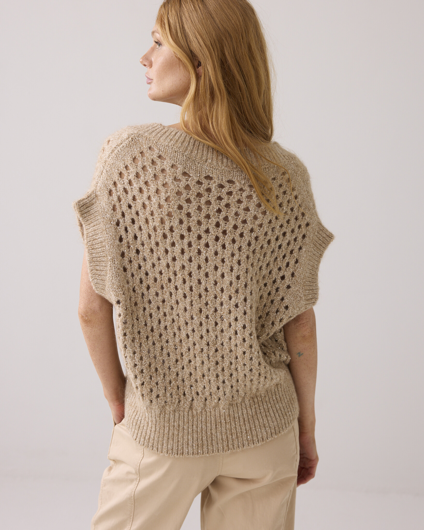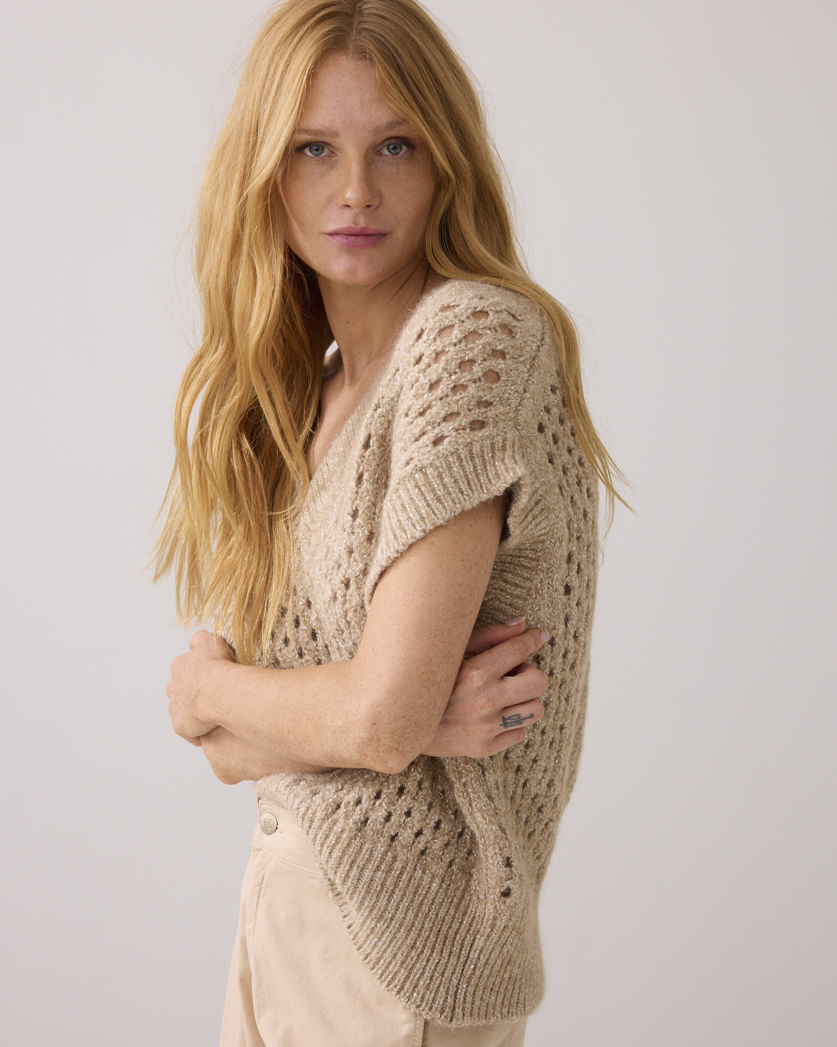 This loose-fitting spencer is knitted in an open stitch with luxurious mohair-blend yarn. The yarn is enriched with small knitted-in sequins. The spencer has a deep V-neck and is finished with high ribbed cuffs.
