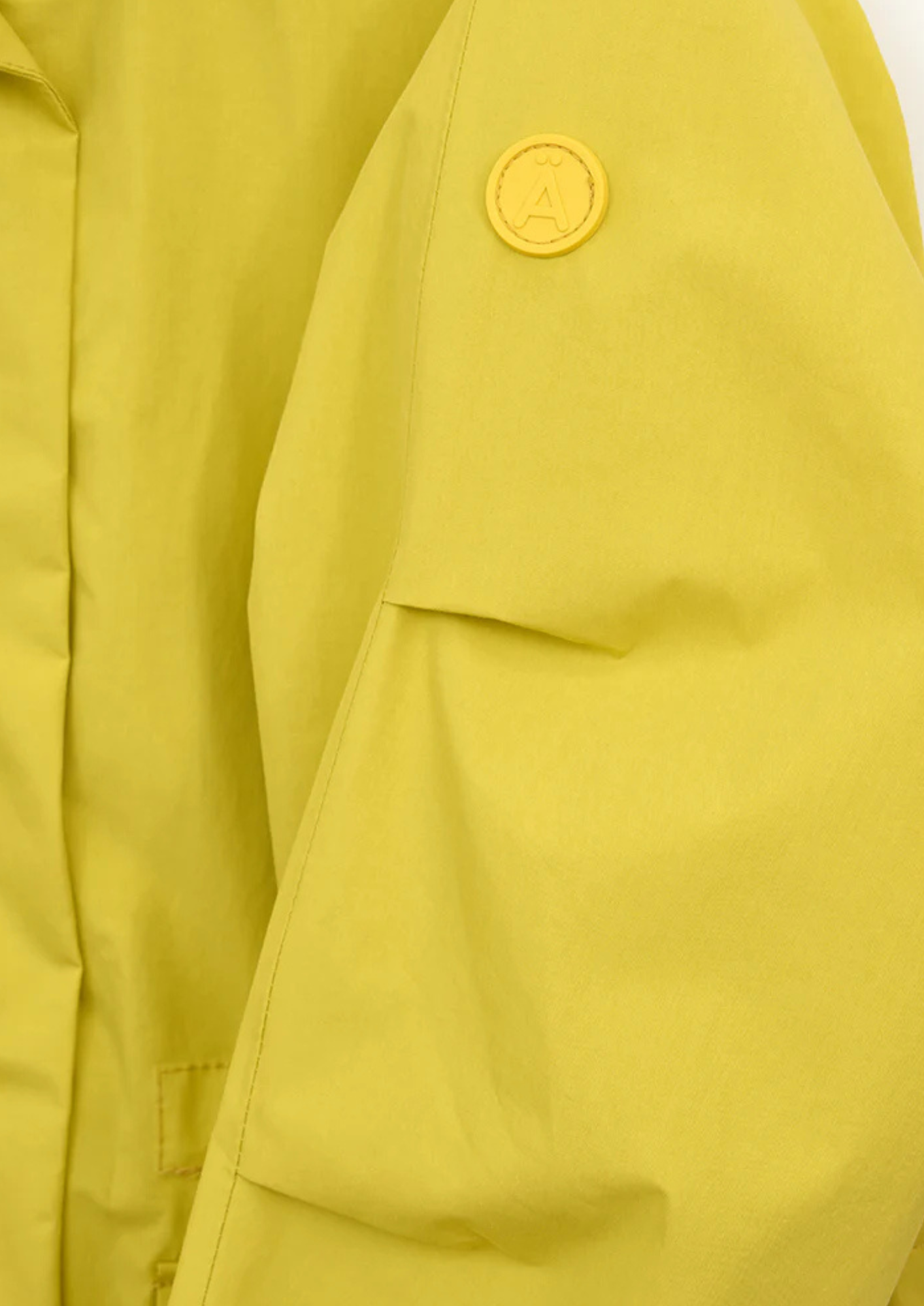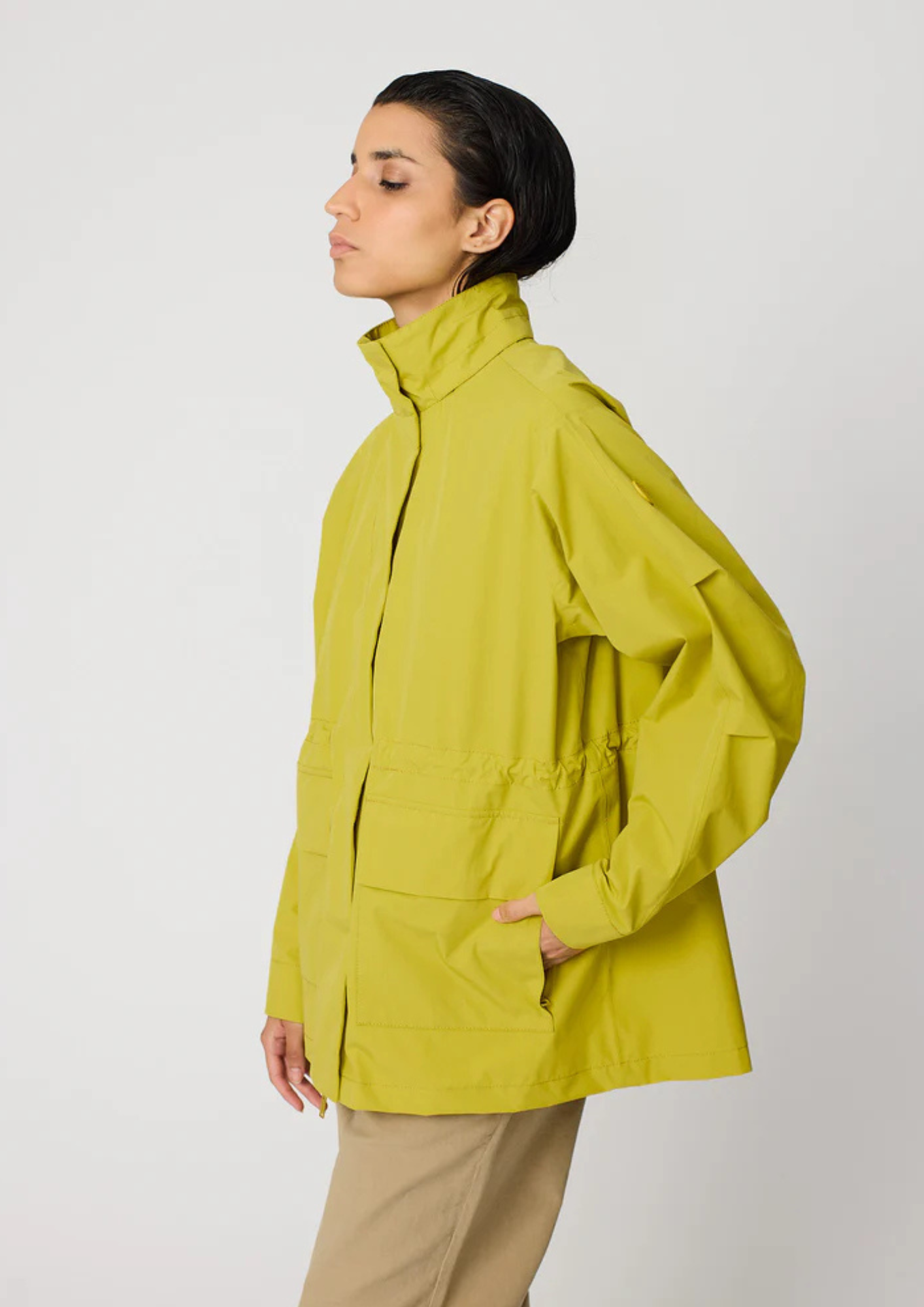 - Detachable hood with drawstring, attached to the collar by snaps; the piece with snaps can be stored inside the collar.