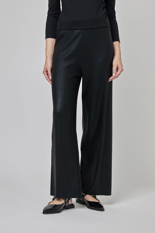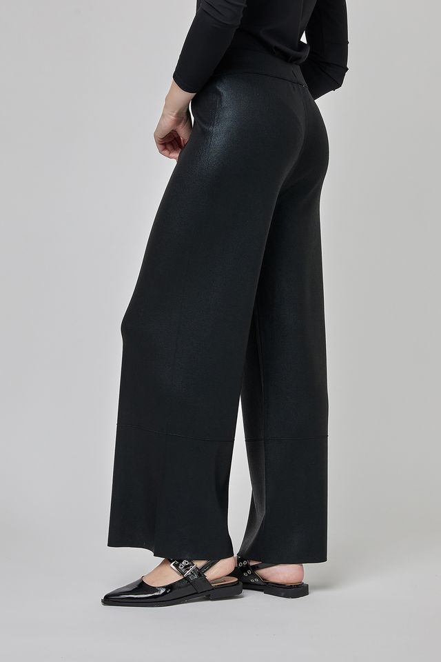 Comfortable, wide-legged knit pants without pockets, with an elastic waistband for an easy fit. The coated fabric makes these pants unique in their quality and originality, adding a modern and sophisticated touch to your outfit.