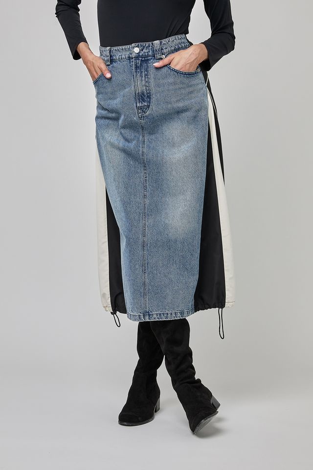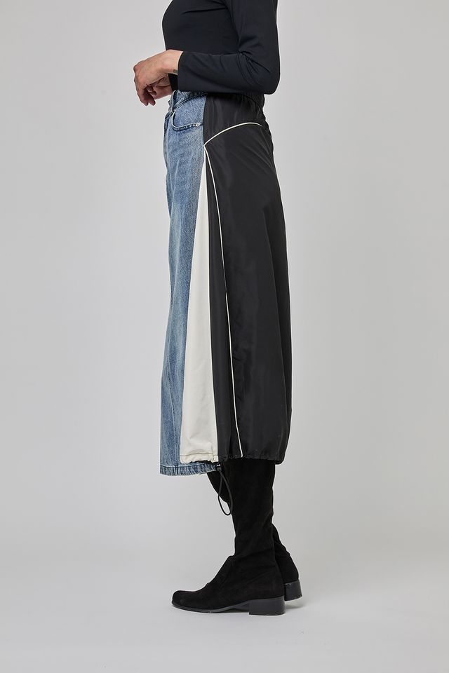 A distinctive skirt combines a rugged denim front with a lightweight nylon back for a modern texture contrast. Flared side panels add movement and a feminine silhouette. A bold mix that combined style and everyday comfort.