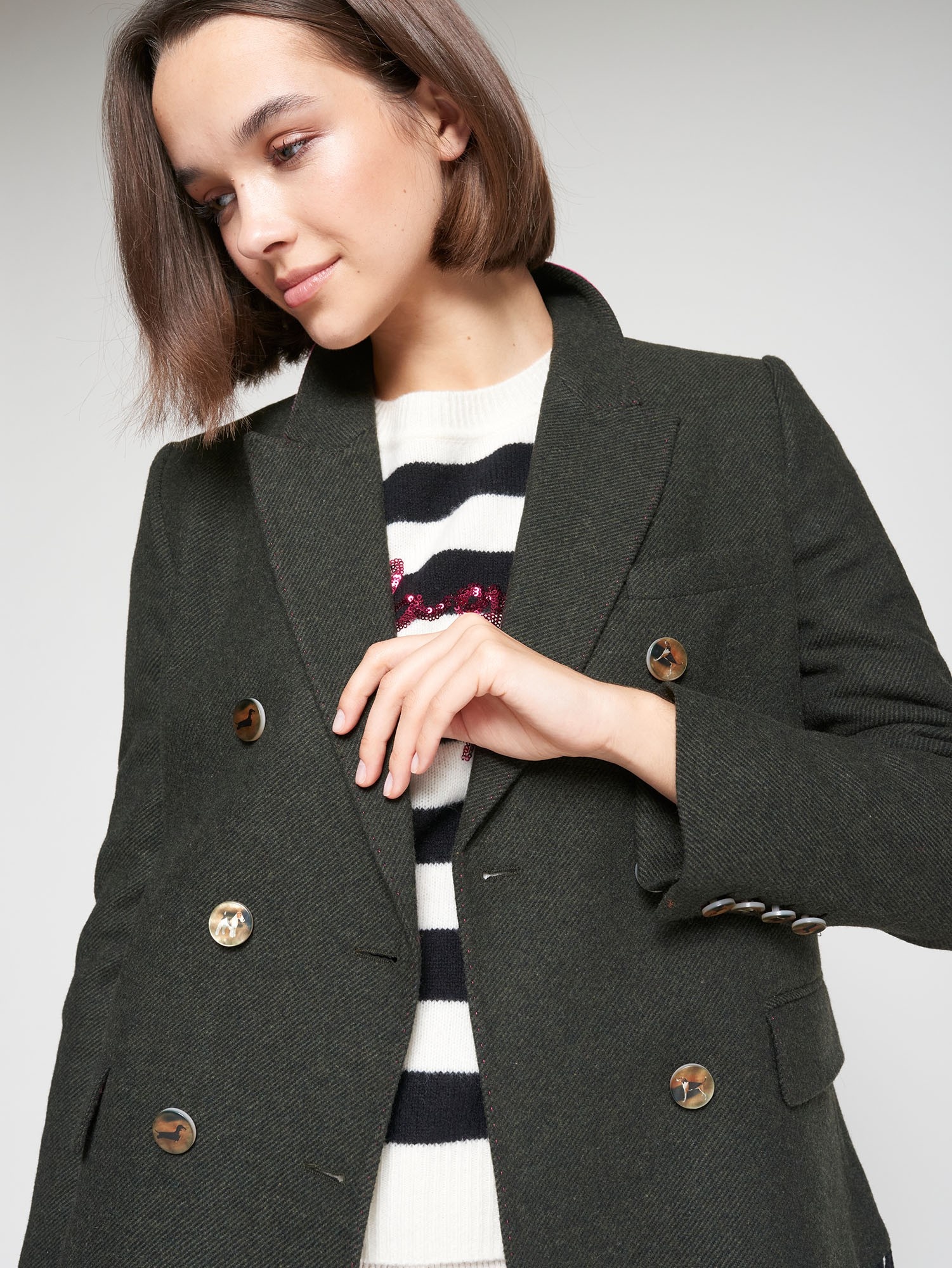 Bomber jacket in a beige, black and grey check pattern. Made from a wool-blend fabric with a straight cut and fringed hem. Features a front zip closure in gold and striped ribbed cuffs. The beige faux fur collar is detachable. Printed lining inside