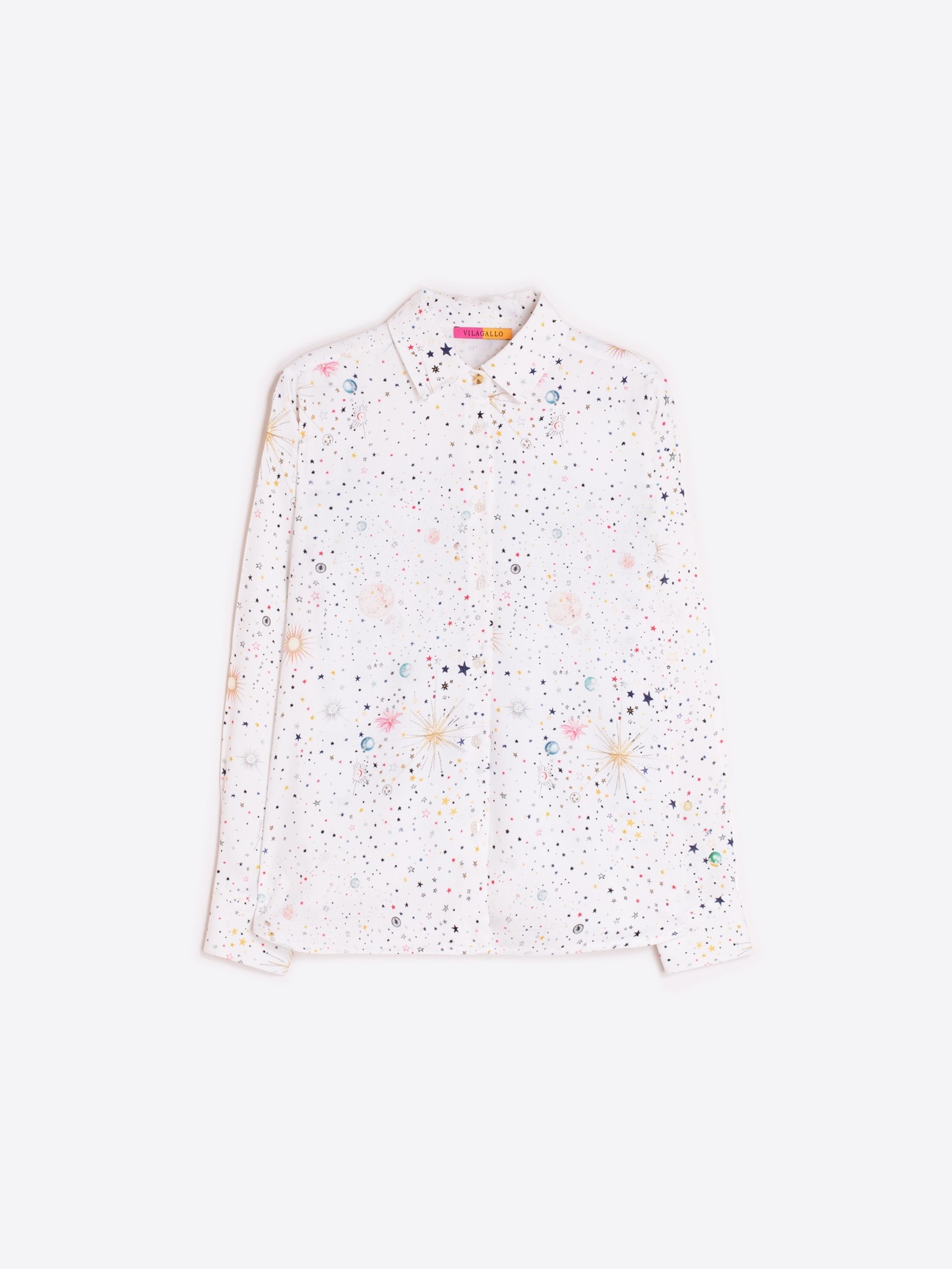 White viscose shirt with multicolour cosmic print and exclusive Vilagallo building placement print on the back. Straight cut, classic shirt collar, long sleeves with buttoned cuffs and slightly rounded hem.