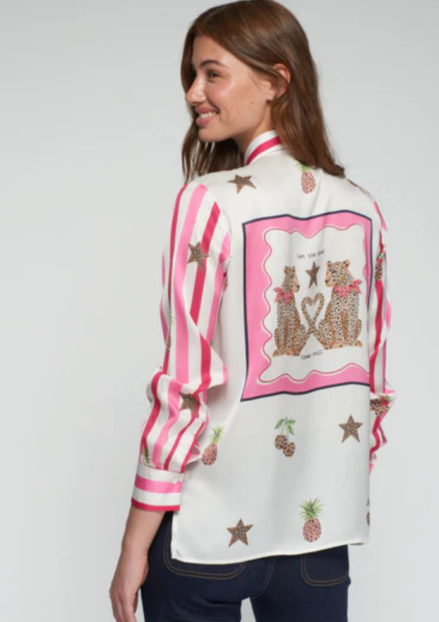 Vertical striped shirt in shades of pink and fuchsia with illustrations of pineapples, stars, and cherries. Leopard print on the back.