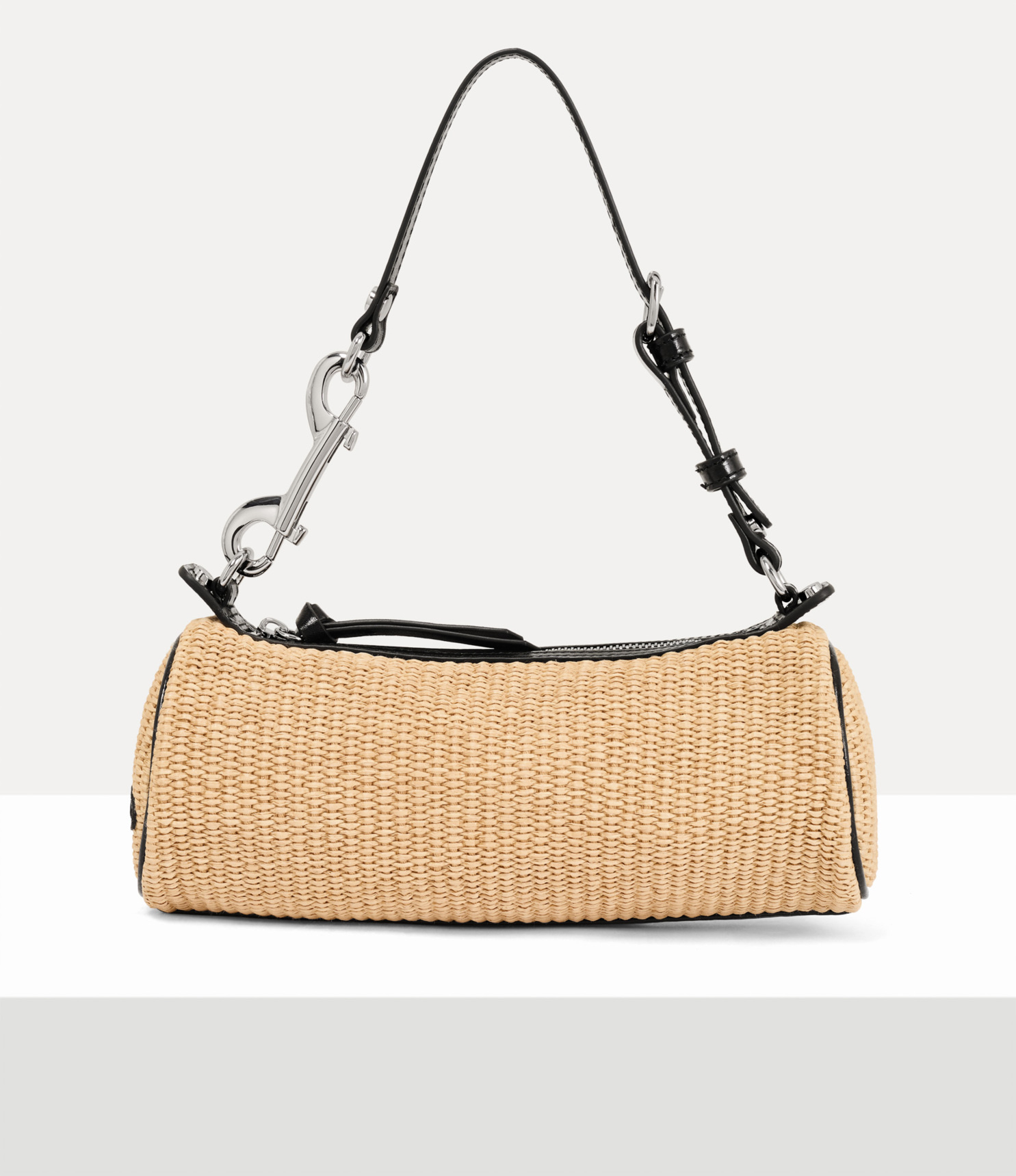 The Vivienne Westwood signature Cindy Cylinder bag is reimagined this season with black leather accents and a finely woven raffia-effect design.
