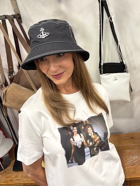 Look cool in this Vivienne Westwood bucket hat with silver orb design on front.