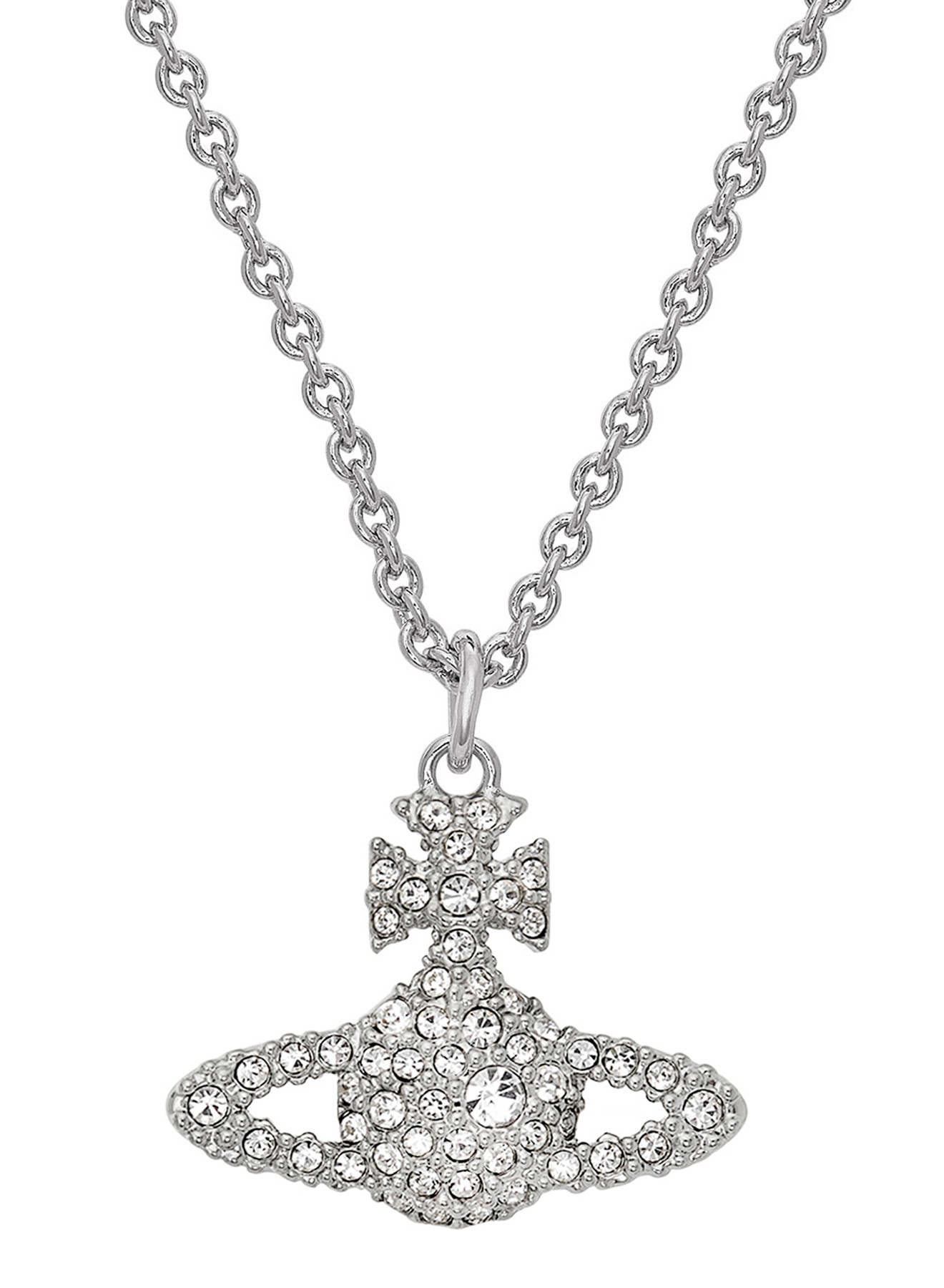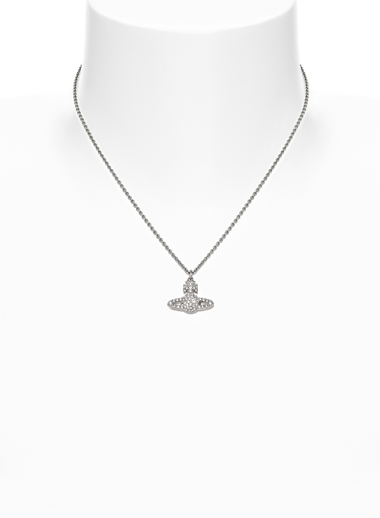 The Grace Bas Relief Pendant necklace features a two-dimensional orb motif at the centre of the design. The piece offers a surface of white crystals decorating the silhouette, complete with polished, silver-tone plating.